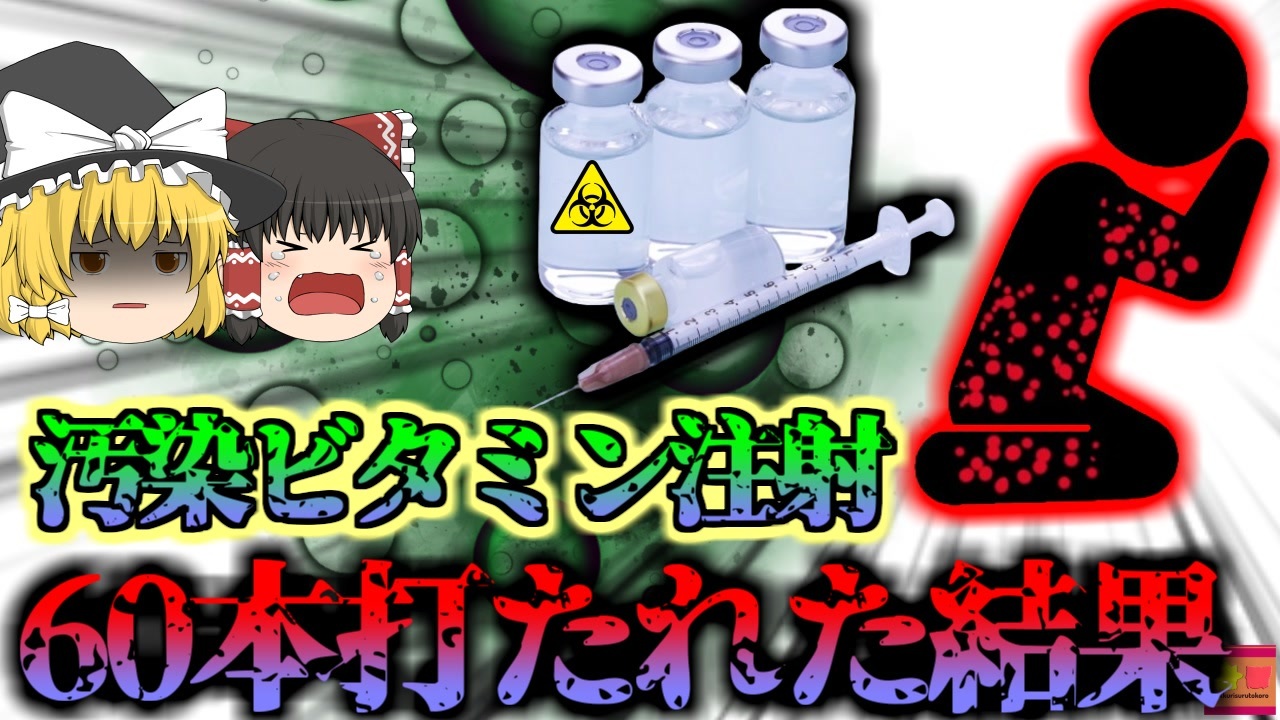 <a href="#" class="seekTime" data-seekTime="00:00" onclick="seekNicoPlayer('#00:00'); return false;">#00:00</a> OP<br><a href="#" class="seekTime" data-seekTime="00:32" onclick="seekNicoPlayer('#00:32'); return false;">#00:32</a> 視聴上の注意<br><a href="#" class="seekTime" data-seekTime="00:59" onclick="seekNicoPlayer('#00:59'); return false;">#00:59</a> 本編開始<br><a href="#" class="seekTime" data-seekTime="2:13" onclick="seekNicoPlayer('#2:13'); return false;">#2:13</a> スパを利用していたAさん<br><a href="#" class="seekTime" data-seekTime="2:45" onclick="seekNicoPlayer('#2:45'); return false;">#2:45</a> ビタミン注射<br><a href="#" class="seekTime" data-seekTime="3:47" onclick="seekNicoPlayer('#3:47'); return false;">#3:47</a> 合計60本の注射<br><a href="#" class="seekTime" data-seekTime="4:36" onclick="seekNicoPlayer('#4:36'); return false;">#4:36</a> 翌日からの異変<br><a href="#" class="seekTime" data-seekTime="5:16" onclick="seekNicoPlayer('#5:16'); return false;">#5:16</a> 恐ろしい症状<br><a href="#" class="seekTime" data-seekTime="6:48" onclick="seekNicoPlayer('#6:48'); return false;">#6:48</a> 我慢できずに救急車を呼んだAさん<br><a href="#" class="seekTime" data-seekTime="7:26" onclick="seekNicoPlayer('#7:26'); return false;">#7:26</a> 「マイコバクテロイズ腫瘍」<br><a href="#" class="seekTime" data-seekTime="8:25" onclick="seekNicoPlayer('#8:25'); return false;">#8:25</a> 汚染された注射器<br><a href="#" class="seekTime" data-seekTime="8:44" onclick="seekNicoPlayer('#8:44'); return false;">#8:44</a> 辛く長い治闘病生活<br><a href="#" class="seekTime" data-seekTime="9:37" onclick="seekNicoPlayer('#9:37'); return false;">#9:37</a> スパの杜撰さ<br><a href="#" class="seekTime" data-seekTime="10:33" onclick="seekNicoPlayer('#10:33'); return false;">#10:33</a> メディアインタビューで語ったAさん<br><a href="#" class="seekTime" data-seekTime="11:00" onclick="seekNicoPlayer('#11:00'); return false;">#11:00</a> 日本でもクリニック関係のトラブルは多い<br><a href="#" class="seekTime" data-seekTime="12:09" onclick="seekNicoPlayer('#12:09'); return false;">#12:09</a> 注意すること<br><br>今回紹介するのは、アメリカのクリニックで発生した、感染症事例です。<br>アメリカ合衆国カリフォルニア州、ロサンゼルスに暮らしていた女性「Aさん」は、地域のスパを利用し、そこに併設されていた美容クリニックで、ビタミン注射の施術を受けていました。<br>女性スタッフは「ビタミン注射は沢山打った方が効果が出ますよ」とAさんに伝え、左右の腕や腹部、背中などに合計60本ものビタミンB12、ビタミンC、脂肪分解用のデオキシコール酸を投与しました。<br>しかし、Aさんは翌日辺りから発熱や悪寒などの症状を発症し、それが悪化した結果、痛みで動くこともできなくなり、救急車を呼んで近くの病院に搬送されました。<br>彼女の皮膚は、無数の赤黒い大きな発疹ができ、まるで壊●したようになってしまい、Aさんは「このままでは皮膚が腐って死んでしまう」と恐ろしくなったといいます。<br>医師の診察・検査を受けたところ、彼女は皮膚感染症「マイコバクテロイデス腫瘍」と診断され、抗生物質を毎日六時間以上投与する治療がはじまりました。<br>ですが、ひどく変化してしまった皮膚の一部は、切除するしか手がなく、彼女は一年間で繰り返し切除手術を受ける、辛い日々を過ごし・・・<br><br>引用・出展・参考<br>独立行政法人 国民生活センター<br>増加する美容医療サービスのトラブル-不安をあおられたり、割引のあるモニター契約を勧められても慎重に判断を!<br>美容医療サービスのトラブル防止のポイント[PDF形式](638KB)<br><a href="https://ishort.ink/126n" target="_blank" rel="noopener nofollow">https://ishort.ink/126n</a><br><br />※この動画は過去の事件を知り、現在でも同じことが発生する危険性を再認識、関与しないように促すための動画であり、視聴者を扇動、動揺を誘うためのコンテンツではありません。<br><br>ご要望にお応えして、メンバーシップの開設を行いました。<br>下記URLからも登録可能ですので、ご興味がある方は是非ご参加ください。<br><a href="https://www.youtube.com/channel/UCcT5a1J7XJW7CLYI2RKl4pw/join" target="_blank" rel="noopener nofollow">https://www.youtube.com/channel/UCcT5a1J7XJW7CLYI2RKl4pw/join</a><br><br><br>Twitter<br>→<a href="https://twitter.com/yukkurisurutoko" target="_blank" rel="noopener nofollow">https://twitter.com/yukkurisurutoko</a><br><br>取り急ぎ、簡易的にですがマイリストを作りました。<br>【ゆっくり解説】事故・事件関係紹介リスト <br><a href="https://www.nicovideo.jp/mylist/71034319" target="_blank" rel="noopener nofollow">https://www.nicovideo.jp/mylist/71034319</a><br>【ゆっくり解説】放射線系事故<br><a href="https://www.nicovideo.jp/mylist/71034368" target="_blank" rel="noopener nofollow">https://www.nicovideo.jp/mylist/71034368</a><br>【ゆっくり解説】鉄道系事故・事件関連<br><a href="https://www.nicovideo.jp/mylist/71034379" target="_blank" rel="noopener nofollow">https://www.nicovideo.jp/mylist/71034379</a>