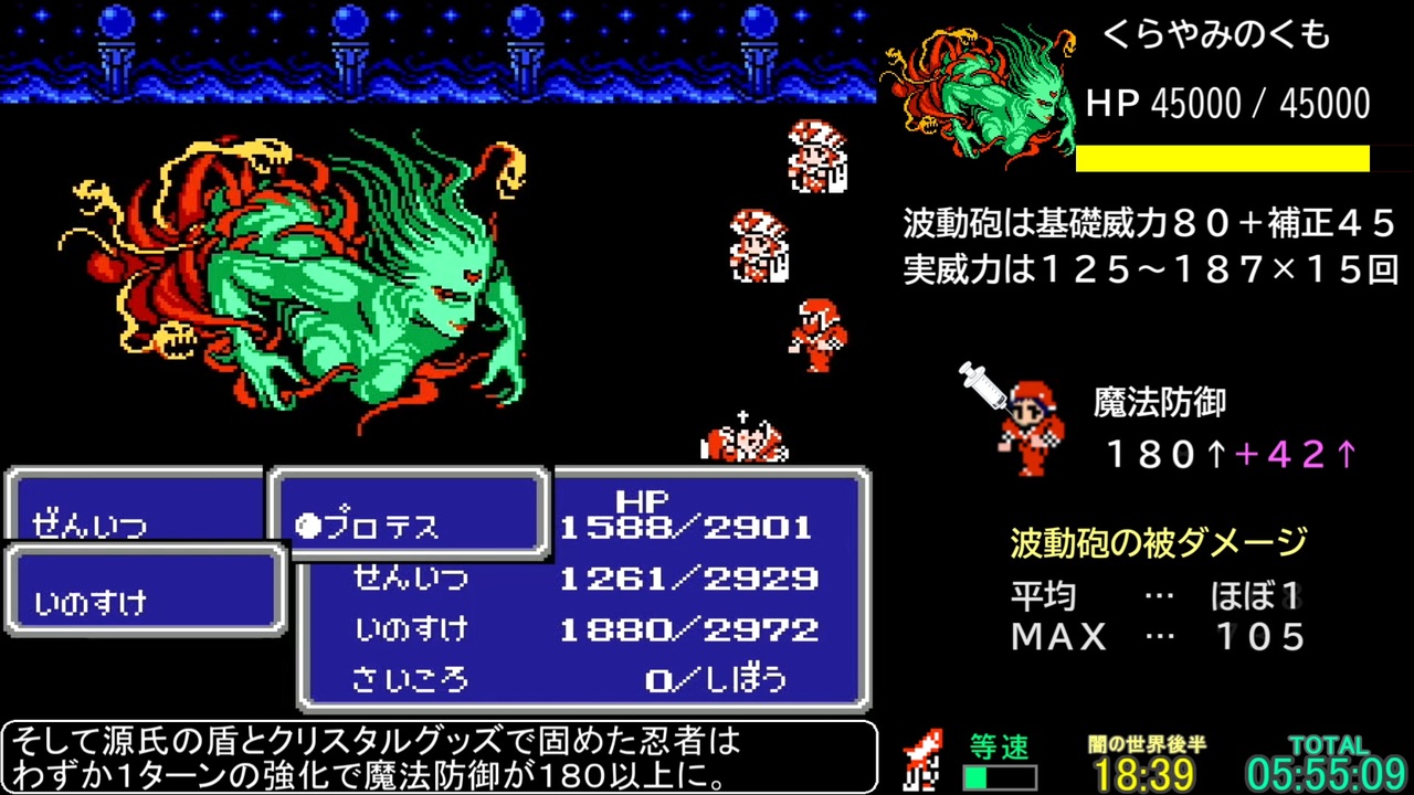 vsケルベロス・エキドナ・アーリマン・暗闇の雲<br>前→<a href="https://www.nicovideo.jp/watch/sm43293822" class="watch">sm43293822</a><br>●ルール<br>①リセットは開始時のみ<br>②逃げは初回バハムートだけ<br>③エンカウント飛ばしはしない<br>④避けられるバグは避ける<br>※実機でこのルールだとエンディング途中でバグるらしいですが<br>レトロフリークの場合は最後まで拝めます。<br>●参考サイト<br>攻略情報全般 →<a href="http://web.archive.org/web/20040914005204/http://ff3.csidenet.com/" target="_blank" rel="noopener nofollow">http://web.archive.org/web/20040914005204/http://ff3.csidenet.com/</a><br>エンカウント等→<a href="http://surume5.han-be.com/Home/FF2/FF3/text3-1.htm" target="_blank" rel="noopener nofollow">http://surume5.han-be.com/Home/FF2/FF3/text3-1.htm</a><br>マニアックな知識→<a href="http://www.ric.hi-ho.ne.jp/cheap_restaurant/GAME/FF3/index.html" target="_blank" rel="noopener nofollow">http://www.ric.hi-ho.ne.jp/cheap_restaurant/GAME/FF3/index.html</a><br>© SQUARE ENIX<br>LOGO ILLUSTRATION:© YOSHITAKA AMANO<br>記載されている会社名・製品名・システム名などは、各社の商標、または登録商標です。