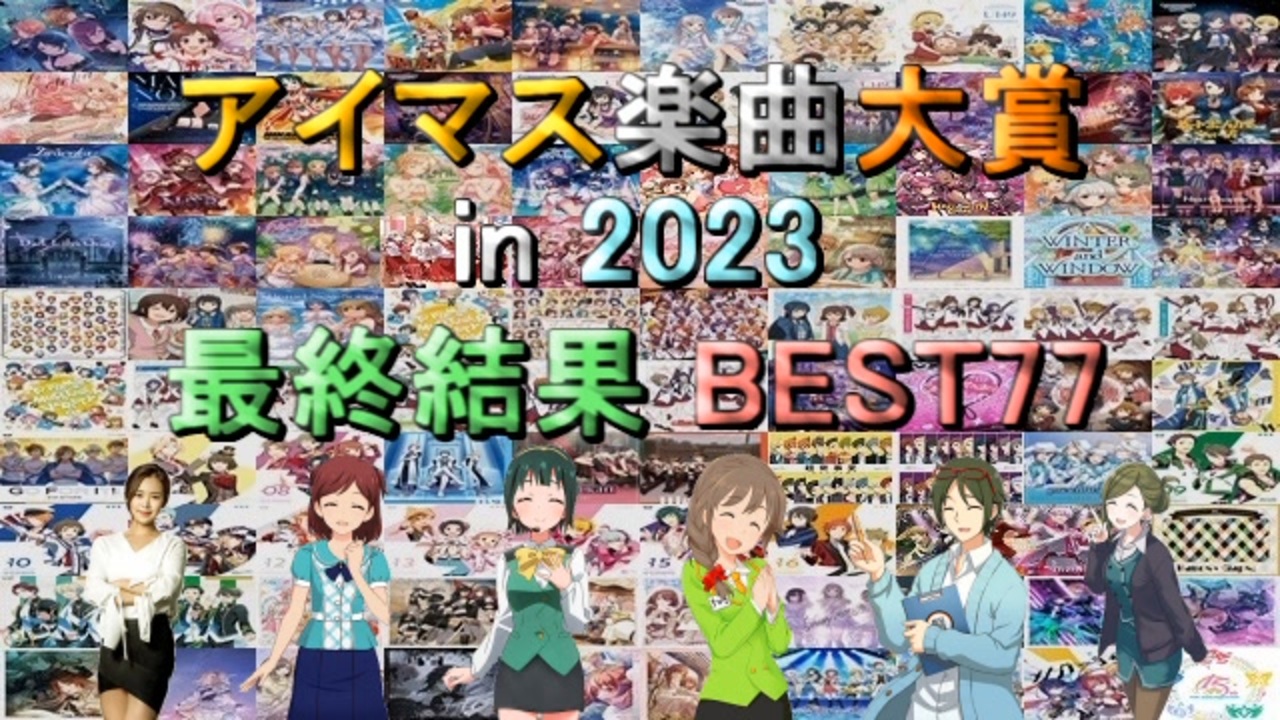 <span style="color: #ff0000; font-size: 24px;"><strong><i>元気に笑おう FIVE FANFARE!!!!!</i></strong></span><br><br><span style="color: #0000ff;"><strong>2023年にFull音源版が発売 or 配信</strong></span>されたアイマス関連の楽曲<br>(<span style="color: #ff9900;"><strong>計155曲</strong></span>)に対する人気投票企画の最終結果です。<br><span style="color: #00ff00;"><strong>参加者2974名</strong></span>の回答を集計し、<span style="color: #00ffff;"><strong>獲得pt上位77曲</strong></span>を【<span style="color: #9900ff;"><strong>分野別データ</strong></span>】と<br>【<span style="color: #ff00ff;"><strong>皆様から頂いたコメント</strong></span>】を合わせてご紹介していきます。<br><br>※一部楽曲の制作者情報に誤りがありました。<br> 現在は修正完了しております。ご報告ありがとうございました。<br><br><span style="font-size: 16px;"><strong>☆配布データ:<a href="https://x.gd/cNqdl" target="_blank" rel="noopener nofollow">https://x.gd/cNqdl</a></strong></span><br><br>●「アイマス楽曲大賞 最終結果まとめ」:<a href="https://www.nicovideo.jp/mylist/70533939" target="_blank" rel="noopener">mylist/70533939</a><br>●『アイマス楽曲ランキングシリーズ』:<a href="https://www.nicovideo.jp/mylist/57911966" target="_blank" rel="noopener">mylist/57911966</a><br>●『THE IDOLM@STER Song Collection』:<a href="https://www.nicovideo.jp/mylist/61493969" target="_blank" rel="noopener">mylist/61493969</a><br><br><a target="_blank" href="https://qa.nicovideo.jp/faq/show/19424?site_domain=default" style="font-size: 13px;color: #657586; text-decoration: underline; line-height: 1.4">この動画は投稿者によって修正されました</a>