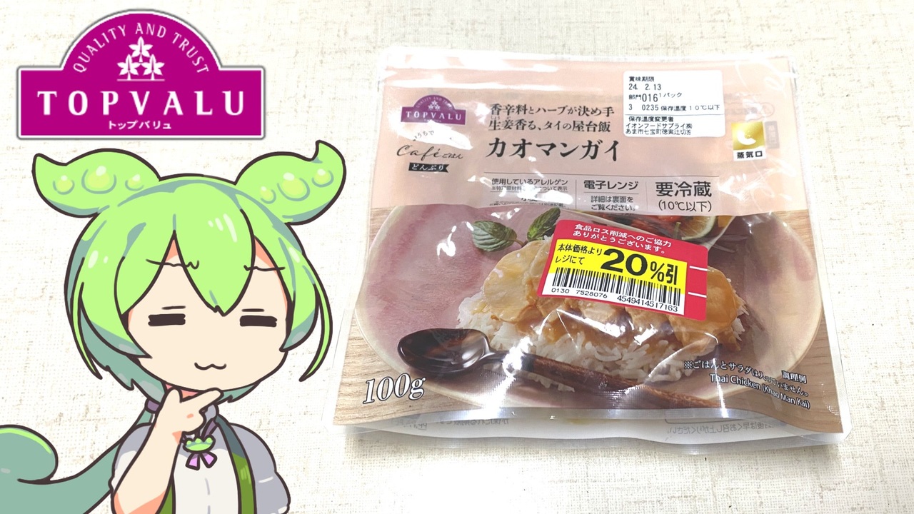 トップバリュのカフェごはんシリーズ「カオマンガイ」です。<br><br><br>【参考】<br>おうちで楽しむカフェごはん カオマンガイ(トップバリュ)<br><a href="https://www.topvalu.net/items/detail/4549414517163/" target="_blank" rel="noopener nofollow">https://www.topvalu.net/items/detail/4549414517163/</a><br>株式会社ウェルファムフーズ<br><a href="https://www.wellfam-foods.co.jp/" target="_blank" rel="noopener nofollow">https://www.wellfam-foods.co.jp/</a><br>鶏のうまみ&タレが決め手!タイのソウルフード<br>「カオマンガイ」でエスニックな夏ごはん♪(キナリノ)<br><a href="https://kinarino.jp/cat4/31498" target="_blank" rel="noopener nofollow">https://kinarino.jp/cat4/31498</a><br>絶対に外せない!本場のタイ料理3 【ご飯&麺類】(ASEAN Travel)<br><a href="https://travel.asean.or.jp/thailand/1360/" target="_blank" rel="noopener nofollow">https://travel.asean.or.jp/thailand/1360/</a><br><br><br>【使用した素材】(※敬称略)<br>(合成音声)VOICEVOX/ずんだもん/四国めたん<br><a href="https://voicevox.hiroshiba.jp/" target="_blank" rel="noopener nofollow">https://voicevox.hiroshiba.jp/</a><br>(立ち絵)坂本アヒル<br><a href="https://seiga.nicovideo.jp/seiga/im10788496" target="_blank" rel="noopener">im10788496</a>/<a href="https://seiga.nicovideo.jp/seiga/im10791276" target="_blank" rel="noopener">im10791276</a><br>(楽曲)甘茶の音楽工房/「楽しい麦畑」「お城の舞踏会」<br><a href="https://amachamusic.chagasi.com/" target="_blank" rel="noopener nofollow">https://amachamusic.chagasi.com/</a>