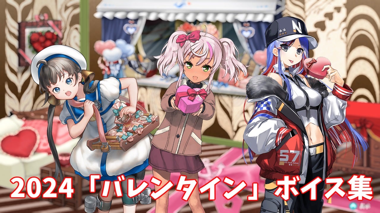 22隻の新規「バレンタイン」ボイスと、潮改二の新規母港ボイス集です。<br>2023年の「バレンタイン」ボイスはこちら→ <a href="https://www.nicovideo.jp/watch/sm41801848" class="watch">sm41801848</a> <br><br>バレンタインボイス等(図鑑No.順)<br>(漣 潮改二 白露改二 時雨改三 春雨 清霜 藤波改 Rodney 宗谷 夕暮 第二十二号海防艦 Javelin <br>能美 稲木 Tuscaloosa Nevada C.Cappellini Heywood_L.E 熊野丸 第百一号輸送艦 朝日 白雲)<br><br>【新規絵】<br>(South_Dakota 涼波 伊201 伊203 第二十二号海防艦 C.Cappellini)<br>※伊201と伊203の改差分は中破のみのようです。<br><br>前|2024「節分」ボイス集 (1/25アップデート②) <a href="https://www.nicovideo.jp/watch/sm43325632" class="watch">sm43325632</a><br><strong>次|2024「ホワイトデー」ボイス集 (3/13アップデート) </strong><a href="https://www.nicovideo.jp/watch/sm43527313" class="watch">sm43527313</a><br><br>艦これ追加ボイス集 マイリスト(<a href="https://www.nicovideo.jp/mylist/40513442" target="_blank" rel="noopener">mylist/40513442</a>)<br>シリーズ(<a href="https://www.nicovideo.jp/series/34200" target="_blank" rel="noopener">series/34200</a>)<br><br>Youtubeでも活動しています。<br>チャンネル <a href="https://www.youtube.com/channel/UCTYYB9O7hiQlH6Ee-Xxlbpg" target="_blank" rel="noopener nofollow">https://www.youtube.com/channel/UCTYYB9O7hiQlH6Ee-Xxlbpg</a><br>