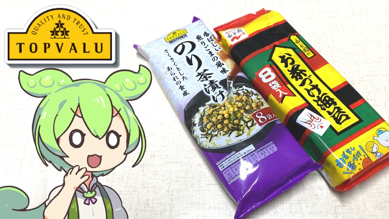 今回紹介するのはトップバリュのお茶漬けのもと<br>永谷園とどれだけ違いがあるのでしょうか<br><br><br>【参考】<br>海苔茶漬け(トップバリュ)<br><a href="https://www.topvalu.net/items/detail/4549741872423/" target="_blank" rel="noopener nofollow">https://www.topvalu.net/items/detail/4549741872423/</a><br>株式会社 真誠<br><a href="https://www.shinsei-ip.ne.jp/" target="_blank" rel="noopener nofollow">https://www.shinsei-ip.ne.jp/</a><br>胡麻の郷<br><a href="https://www.shinsei-ip.ne.jp/goma/index.html" target="_blank" rel="noopener nofollow">https://www.shinsei-ip.ne.jp/goma/index.html</a><br>永谷園のお茶漬け<br><a href="https://www.nagatanien.co.jp/product/lst/1/" target="_blank" rel="noopener nofollow">https://www.nagatanien.co.jp/product/lst/1/</a><br>永谷園のお茶づけがニッポンの食卓から広げた浮世絵文化(アダチ版画研究所)<br><a href="https://www.adachi-hanga.com/hokusai/page/enjoy_101" target="_blank" rel="noopener nofollow">https://www.adachi-hanga.com/hokusai/page/enjoy_101</a><br>永谷園のお茶づけ『名画カード』復活 19年ぶり再登場の理由を聞く(with news)<br><a href="https://withnews.jp/article/f0161113000qq000000000000000W00o10101qq000014293A" target="_blank" rel="noopener nofollow">https://withnews.jp/article/f0161113000qq000000000000000W00o10101qq000014293A</a><br><br><br>【使用した素材】(※敬称略)<br>(合成音声)VOICEVOX/ずんだもん/四国めたん<br><a href="https://voicevox.hiroshiba.jp/" target="_blank" rel="noopener nofollow">https://voicevox.hiroshiba.jp/</a><br>(立ち絵)坂本アヒル<br><a href="https://seiga.nicovideo.jp/seiga/im10788496" target="_blank" rel="noopener">im10788496</a>/<a href="https://seiga.nicovideo.jp/seiga/im10791276" target="_blank" rel="noopener">im10791276</a><br>(楽曲)甘茶の音楽工房/「楽しい麦畑」「お城の舞踏会」<br><a href="https://amachamusic.chagasi.com/" target="_blank" rel="noopener nofollow">https://amachamusic.chagasi.com/</a>