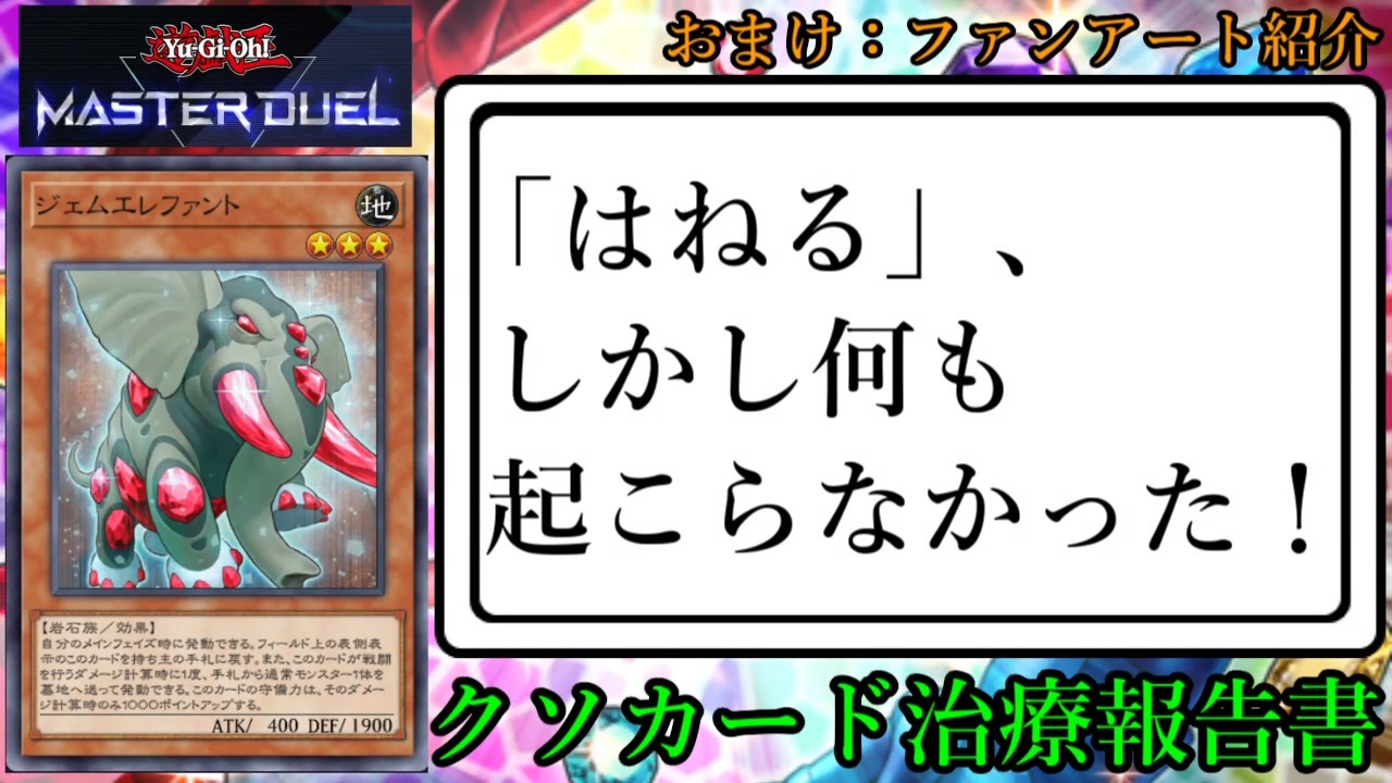 クソカード医学会報告書、第8弾です。<br>イゾルデギミックに初挑戦です。初挑戦とはいっても、実はリプレイの収録は10月です(超遅刻)。<br><br>ファンアートもいただきました。感謝してもしきれません!<br><br>ポケモン関連のイラストもありますので、今回の編集は少しそれに絡めています。<br>また、「イゾルデギミックは、ワンキルの最適解が既に存在しているけど、それ以外のカードの治療でも、芸術発表として十分に価値がある」という趣旨の意見を聞いたことも影響しています。<br><br>次回は《炎神機-紫龍》の解説を予定しております。<br><br><span style="color: #ff0000;">追記:<a href="#" class="seekTime" data-seekTime="0:39" onclick="seekNicoPlayer('#0:39'); return false;">#0:39</a>の《VFD》の可愛い鳴き声には、元音声に再生速度60%ほどの補正がかかっております。</span><br><br>今回遊んだゲーム:<br> 遊戯王マスターデュエル <a href="https://www.konami.com/yugioh/masterduel/jp/ja/" target="_blank" rel="noopener nofollow">https://www.konami.com/yugioh/masterduel/jp/ja/</a><br><br>リスペクト先:<br>あまくだり 様 <a href="https://www.nicovideo.jp/user/82678858" target="_blank" rel="noopener nofollow">https://www.nicovideo.jp/user/82678858</a><br><br>Special Thanks:<br>かんかさ 様(今回の対戦相手)<br>もにき 様(ファンアートを頂きました!) <a href="https://www.pixiv.net/users/43111487" target="_blank" rel="noopener nofollow">https://www.pixiv.net/users/43111487</a><br>雪月 様(ファンアートを頂きました!) <a href="https://www.pixiv.net/users/45868000" target="_blank" rel="noopener nofollow">https://www.pixiv.net/users/45868000</a><br>紫紅魔 様(ファンアートを頂きました!) <a href="https://www.pixiv.net/users/17340846" target="_blank" rel="noopener nofollow">https://www.pixiv.net/users/17340846</a><br>その他 デッキ相談、対戦にご協力いただいた非公式医学会サーバーのみなさま<br><br>非公式クソカード医学会サーバー:<a href="https://discord.gg/pejHy5mQFT" target="_blank" rel="noopener nofollow">https://discord.gg/pejHy5mQFT</a><br><br>前回 <a href="https://www.nicovideo.jp/watch/sm43311535" class="watch">sm43311535</a> / 次回 <a href="https://www.nicovideo.jp/watch/sm43606913" class="watch">sm43606913</a><br><br>作った動画 <a href="https://www.nicovideo.jp/mylist/72794101" target="_blank" rel="noopener">mylist/72794101</a>