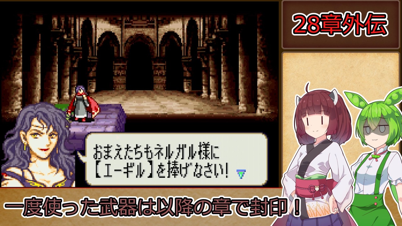 <span style="color: #85200c; font-size: 24px;"><strong><i>ちょっと忙しくて編集が遅れてしまいました…<br>後編は早めに上げられるようにします!</i></strong></span><br><br><strong>ルール1:一度使用した武器種は、以降の章で使用する事を禁止する。<br>ルール2:武器の使用の定義は『その武器を装備した状態で敵との戦闘が発生したタイミング』『その武器を売却して換金した場合』杖の場合は『対象に対して使用した時点(命中の可否は問わない)』とする。</strong><br><span style="color: #ff0000;"><strong>※同盟軍、演出による戦闘イベントでは使用した判定にはならないこととする。</strong></span><br><strong>ルール3:難易度はリン編ハード→ヘクトル編ハードとする。<br>ルール4:序章から終章まで外伝、異伝を含む全ての章を攻略し、仲間に出来るユニットは全員加入させ、生存させる。(序章と1章のみ同一の章として扱う)</strong><br><span style="color: #ff0000; font-size: 18px;"><strong>※バグ技禁止</strong></span><br><br>本動画のシリーズリスト【<a href="https://www.nicovideo.jp/series/406473" target="_blank" rel="noopener">series/406473</a>】<br>前作の同縛りプレイ【<a href="https://www.nicovideo.jp/series/316824" target="_blank" rel="noopener">series/316824</a>】<br>前:【<a href="https://www.nicovideo.jp/watch/sm43378832" class="watch">sm43378832</a>】次:【<a href="https://www.nicovideo.jp/watch/sm43449112" class="watch">sm43449112</a>】<br><br><strong>使用したソフト</strong><br>VOICEROID+東北きりたんEX<br>VOICEPEAK 東北きりたん<br>VOICEPEAK ずんだもん<br><strong>お借りした素材</strong><br>ニコニコモンズの皆様(コンテンツツリー参照)