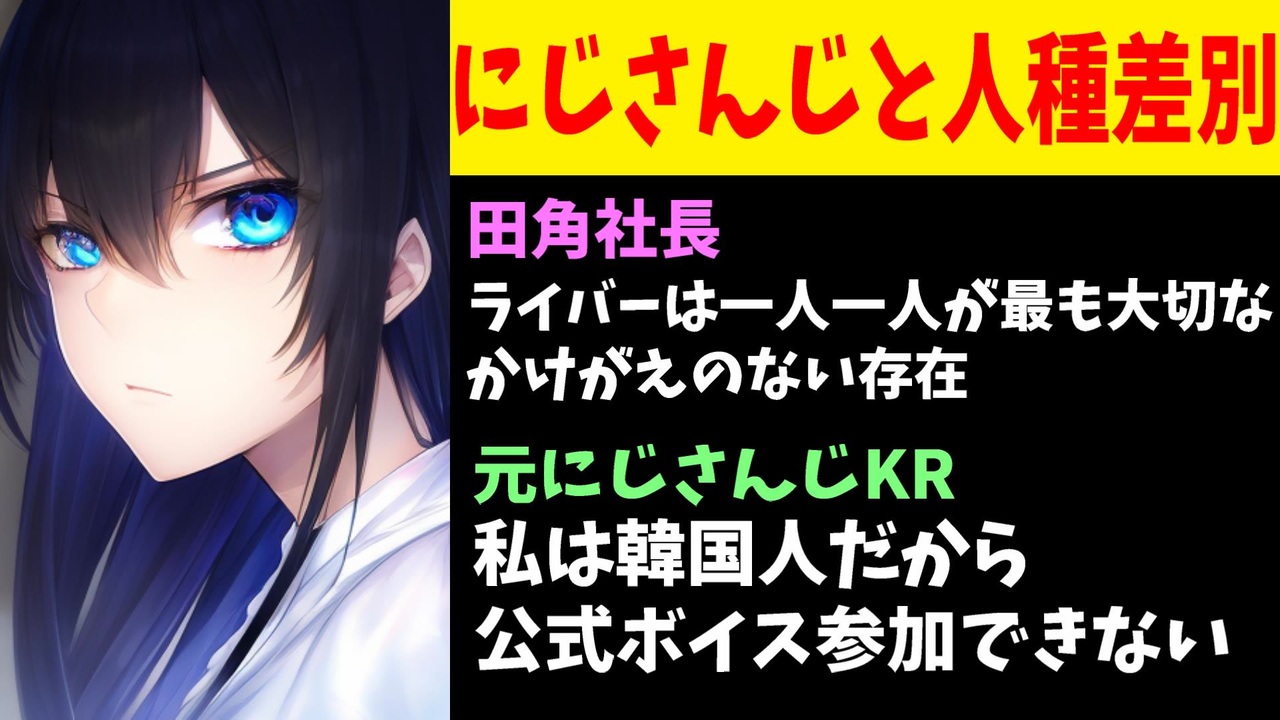 2024年2月14日、にじさんじ所属の韓国人メンバーが日本人なら参加できる公式ボイスに参加できないと発言していました。<br><br>引用<br>ANYCOLOR、代表の謝罪動画を公開 「にじさんじEN」巡る問題で【全文書き起こし、日本語訳あり】<br><a href="https://www.itmedia.co.jp/news/articles/2402/13/news154.html" target="_blank" rel="noopener nofollow">https://www.itmedia.co.jp/news/articles/2402/13/news154.html</a><br><br>Youtube <a href="https://www.youtube.com/@V_Virgin_Mary" target="_blank" rel="noopener nofollow">https://www.youtube.com/@V_Virgin_Mary</a><br>twitter <a href="https://twitter.com/V_Virgin_Mary" target="_blank" rel="noopener nofollow">https://twitter.com/V_Virgin_Mary</a><br><br>使用素材<br>高品質なフリー動画素材 - Pixabay <a href="https://pixabay.com/ja/videos" target="_blank" rel="noopener nofollow">https://pixabay.com/ja/videos</a><br><br>#Dokibrid #Selen #nijisanji #nijisanji_en #nijisanjien #vtuber #vtubers