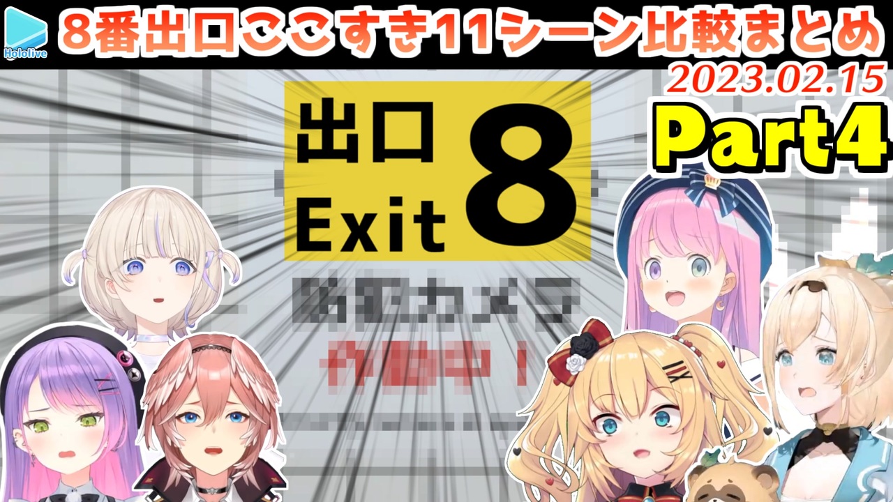 該当する異変を引いてないホロメンもいます<br>このゲームのルールとして"異変"がなければ前に進み"異変"があると思えば戻る、で進展します<br><br><a href="#" class="seekTime" data-seekTime="00:00" onclick="seekNicoPlayer('#00:00'); return false;">#00:00</a> 壁人<br><a href="#" class="seekTime" data-seekTime="03:25" onclick="seekNicoPlayer('#03:25'); return false;">#03:25</a> 停電<br><a href="#" class="seekTime" data-seekTime="04:59" onclick="seekNicoPlayer('#04:59'); return false;">#04:59</a> 目玉<br><a href="#" class="seekTime" data-seekTime="06:40" onclick="seekNicoPlayer('#06:40'); return false;">#06:40</a> 洪水<br><a href="#" class="seekTime" data-seekTime="08:40" onclick="seekNicoPlayer('#08:40'); return false;">#08:40</a> 競歩<br><a href="#" class="seekTime" data-seekTime="09:56" onclick="seekNicoPlayer('#09:56'); return false;">#09:56</a> 顔面崩壊<br><a href="#" class="seekTime" data-seekTime="10:44" onclick="seekNicoPlayer('#10:44'); return false;">#10:44</a> 笑顔<br><a href="#" class="seekTime" data-seekTime="12:01" onclick="seekNicoPlayer('#12:01'); return false;">#12:01</a> 巨大化<br><a href="#" class="seekTime" data-seekTime="13:04" onclick="seekNicoPlayer('#13:04'); return false;">#13:04</a> 覗き<br><a href="#" class="seekTime" data-seekTime="13:55" onclick="seekNicoPlayer('#13:55'); return false;">#13:55</a> 引き返せ<br><a href="#" class="seekTime" data-seekTime="14:52" onclick="seekNicoPlayer('#14:52'); return false;">#14:52</a> 双子<br><br>元動画様はこちら<br>【8番出口】駅から出られなくて困ってるなう!【ホロライブ/赤井はあと】<br><a href="https://youtu.be/XcRlmlxH96M" target="_blank" rel="noopener nofollow">https://youtu.be/XcRlmlxH96M</a><br><br>【 8番出口 】脱出するのは得意です。【常闇トワ/ホロライブ】<br><a href="https://youtu.be/_vABUPQt-X0" target="_blank" rel="noopener nofollow">https://youtu.be/_vABUPQt-X0</a><br><br>【 8番出口 】これ・・・・・・・・・・・・怖いですか???【鷹嶺ルイ/ホロライブ】<br><a href="https://youtu.be/F3AJDktctTE" target="_blank" rel="noopener nofollow">https://youtu.be/F3AJDktctTE</a><br><br>【8番出口】ホラゲ×方向音痴力S+属性ビビリ侍。行きます・・・【風真いろは/ホロライブ】<br><a href="https://youtu.be/TVSoYYo_EYg" target="_blank" rel="noopener nofollow">https://youtu.be/TVSoYYo_EYg</a><br><br>【8番出口】ぼくはどこに行けばいいんだ【轟はじめ/ReGLOSS】hololiveDEV_IS<br><a href="https://youtu.be/835zGQgejDE" target="_blank" rel="noopener nofollow">https://youtu.be/835zGQgejDE</a><br><br>【 8番出口 | ホラゲ 】何も知らない状態でプレイしてみるのら!【姫森ルーナ/ホロライブ】<br><a href="https://youtu.be/dCENlUx0ffc" target="_blank" rel="noopener nofollow">https://youtu.be/dCENlUx0ffc</a><br><br>Akaihaato Ch. 赤井はあと <a href="https://t.co/1y1AhHTbnF" target="_blank" rel="noopener nofollow">https://t.co/1y1AhHTbnF</a><br>Luna Ch. 姫森ルーナ <a href="https://t.co/65lIXbf9zT" target="_blank" rel="noopener nofollow">https://t.co/65lIXbf9zT</a><br>Towa Ch. 常闇トワ <a href="https://t.co/w6M3gpLfyP" target="_blank" rel="noopener nofollow">https://t.co/w6M3gpLfyP</a><br>Lui ch. 鷹嶺ルイ - holoX - <a href="https://t.co/FT5ZgISmcf" target="_blank" rel="noopener nofollow">https://t.co/FT5ZgISmcf</a><br>Iroha ch. 風真いろは - holoX - <a href="https://t.co/3uBFLQOmau" target="_blank" rel="noopener nofollow">https://t.co/3uBFLQOmau</a><br>Hajime Ch. 轟はじめ ‐ ReGLOSS <a href="https://t.co/2POqy5i6MM" target="_blank" rel="noopener nofollow">https://t.co/2POqy5i6MM</a><br /><span style="color: #b7b7b7; font-size: 10px;">ホロライブ切り抜き/なめたけ <a href="https://t.co/CBwJLnYR2c" target="_blank" rel="noopener nofollow">https://t.co/CBwJLnYR2c</a></span>