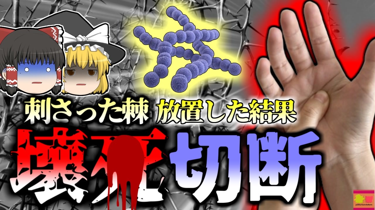 <a href="#" class="seekTime" data-seekTime="00:00" onclick="seekNicoPlayer('#00:00'); return false;">#00:00</a> OP<br><a href="#" class="seekTime" data-seekTime="1:01" onclick="seekNicoPlayer('#1:01'); return false;">#1:01</a> 視聴上の注意<br><a href="#" class="seekTime" data-seekTime="1:35" onclick="seekNicoPlayer('#1:35'); return false;">#1:35</a> 本編開始<br><a href="#" class="seekTime" data-seekTime="2:22" onclick="seekNicoPlayer('#2:22'); return false;">#2:22</a> サイクリングをしていたAさん<br><a href="#" class="seekTime" data-seekTime="2:35" onclick="seekNicoPlayer('#2:35'); return false;">#2:35</a> 棘の茂みで転倒<br><a href="#" class="seekTime" data-seekTime="3:13" onclick="seekNicoPlayer('#3:13'); return false;">#3:13</a> 異変<br><a href="#" class="seekTime" data-seekTime="4:13" onclick="seekNicoPlayer('#4:13'); return false;">#4:13</a> 右手が壊死<br><a href="#" class="seekTime" data-seekTime="4:44" onclick="seekNicoPlayer('#4:44'); return false;">#4:44</a> 霊夢悲鳴<br><a href="#" class="seekTime" data-seekTime="5:00" onclick="seekNicoPlayer('#5:00'); return false;">#5:00</a> A群溶血性レンサ球菌<br><a href="#" class="seekTime" data-seekTime="6:49" onclick="seekNicoPlayer('#6:49'); return false;">#6:49</a> 長期間放置した結果<br><a href="#" class="seekTime" data-seekTime="7:35" onclick="seekNicoPlayer('#7:35'); return false;">#7:35</a> 利き腕を失った<br><a href="#" class="seekTime" data-seekTime="8:39" onclick="seekNicoPlayer('#8:39'); return false;">#8:39</a> ケガを負った際は適切な処置を<br><br>今回紹介するのは、とある感染症に関する事例です。<br>アメリカ合衆国東北部、ニューイングランド地方、ロードアイランド州の街に暮らす消防士の男性「Aさん」はこの日、趣味であるマウンテンバイクに乗り、地元の森林公園でサイクリングをしていました。<br>しかしその最中、小石に乗り上げてしまい、彼は茂みに転倒。大きなケガはありませんでしたが、茂みに植えられていた薔薇の棘が右手に刺さってしまいました。<br>棘は非常に小さなもので、指では取り除くことができなかったため、Aさんはとりあえずそのままにして帰宅。<br>ですがAさんは棘の事をすっかり忘れ、そのままいつも通りの生活を送っていましたが、約一カ月ほどが経過したころ。右手に謎の激痛、発熱などの症状が現れ、医療機関を受診したところ、右手の先端内部が壊〇していることが判明。<br>また、検査を行った結果、彼の腕からは「化膿レンサ球菌」が確認され、「劇症型A群溶血性レンサ球菌感染症」による、「壊〇性筋膜炎」を発症していると診断されました。<br>彼の手は重症化しており、すぐにでも患部を切断しなければ、多臓器不全などを起こす危険があり、彼は苦渋の選択を迫られ・・・<br><br>引用・出展・参考文献<br>Wikipedia ロードアイランド州<br><a href="https://ishort.ink/Kf5W" target="_blank" rel="noopener nofollow">https://ishort.ink/Kf5W</a><br>化膿レンサ球菌<br><a href="https://ishort.ink/Bgmk" target="_blank" rel="noopener nofollow">https://ishort.ink/Bgmk</a><br>YomiDr.「傷の治し方」<br><a href="https://ishort.ink/C2Zq" target="_blank" rel="noopener nofollow">https://ishort.ink/C2Zq</a><br><br><br />※この動画は過去の事件を知り、現在でも同じことが発生する危険性を再認識、関与しないように促すための動画であり、視聴者を扇動、動揺を誘うためのコンテンツではありません。<br><br>ご要望にお応えして、メンバーシップの開設を行いました。<br>下記URLからも登録可能ですので、ご興味がある方は是非ご参加ください。<br><a href="https://www.youtube.com/channel/UCcT5a1J7XJW7CLYI2RKl4pw/join" target="_blank" rel="noopener nofollow">https://www.youtube.com/channel/UCcT5a1J7XJW7CLYI2RKl4pw/join</a><br><br><br>Twitter<br>→<a href="https://twitter.com/yukkurisurutoko" target="_blank" rel="noopener nofollow">https://twitter.com/yukkurisurutoko</a><br><br>取り急ぎ、簡易的にですがマイリストを作りました。<br>【ゆっくり解説】事故・事件関係紹介リスト <br><a href="https://www.nicovideo.jp/mylist/71034319" target="_blank" rel="noopener nofollow">https://www.nicovideo.jp/mylist/71034319</a><br>【ゆっくり解説】放射線系事故<br><a href="https://www.nicovideo.jp/mylist/71034368" target="_blank" rel="noopener nofollow">https://www.nicovideo.jp/mylist/71034368</a><br>【ゆっくり解説】鉄道系事故・事件関連<br><a href="https://www.nicovideo.jp/mylist/71034379" target="_blank" rel="noopener nofollow">https://www.nicovideo.jp/mylist/71034379</a>