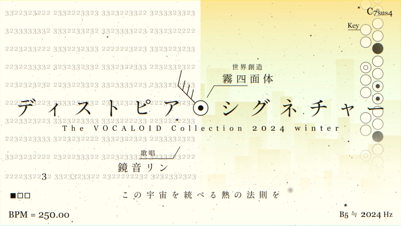 3322323222 2332223323 3323223322 3233323323<br>3233333332 3332233232 3323333223 2332322222<br>2223233222 3332232333 2222223223 3323223233<br>2232233332 3232332332 3332322333 2232332322<br>2232323232 2233223323 3323333223 2333232233<br>2222323223 2333232332 2323232232 2223223232<br>3223323223 3323223333 3323222233 2232222233<br>2232323333 3223232222 3332322323 2233332323<br>3323232222 2322233322 3223233333 3233223222<br>2222332232 3323323322 2322222232 3232332323<br><br>リン「えぇ…」<br><br>ボカコレ2024冬 TOP100ランキング 参加楽曲<br>沢山の応援、ありがとうございました。<br><br>第21回プロセカNEXT応募楽曲<br><br>#59「ディストピア・シグネチャー」<br><br>歌唱 鏡音リン V4X<br><br>音楽 霧四面体<br><a href="https://www.nicovideo.jp/mylist/20316735" target="_blank" rel="noopener">mylist/20316735</a> / <a href="https://x.com/i_coronagraph" target="_blank" rel="noopener nofollow">https://x.com/i_coronagraph</a><br><br>Youtube<br><a href="https://youtu.be/MbKvn4MaJRc" target="_blank" rel="noopener nofollow">https://youtu.be/MbKvn4MaJRc</a><br><br>歌詞, 解説, onvocal (mp3, wav), offvocal, vpr, stem<br><a href="https://4coronagraph.seesaa.net/article/502162405.html" target="_blank" rel="noopener nofollow">https://4coronagraph.seesaa.net/article/502162405.html</a><br><br><a target="_blank" href="https://qa.nicovideo.jp/faq/show/19424?site_domain=default" style="font-size: 13px;color: #657586; text-decoration: underline; line-height: 1.4">この動画は投稿者によって修正されました</a>