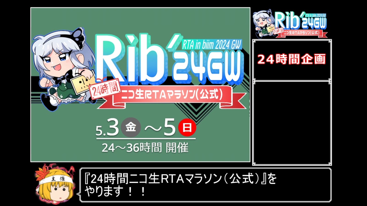 オールナイト開催やるゾ<br><br><span style="font-size: 18px;"><strong>本日21時より告知放送<br><a href="https://live.nicovideo.jp/watch/lv344349367" target="_blank" rel="noopener nofollow">https://live.nicovideo.jp/watch/lv344349367</a></strong></span><br><br>走者募集フォーム:<br><a href="https://docs.google.com/forms/d/e/1FAIpQLSdghU49jh_RuTu3XzuMqixicCT6k06uG_iJg7zBCGiPYXS3Cg/viewform" target="_blank" rel="noopener nofollow">https://docs.google.com/forms/d/e/1FAIpQLSdghU49jh_RuTu3XzuMqixicCT6k06uG_iJg7zBCGiPYXS3Cg/viewform</a><br><br>開催概要スライド:<br><a href="https://docs.google.com/presentation/d/1TPYpw9lnRFL2KdMp_tCkwAxbONofcQW0rrjeI1pTjew/edit#slide=id.g2b49baa0da5_1_0" target="_blank" rel="noopener nofollow">https://docs.google.com/presentation/d/1TPYpw9lnRFL2KdMp_tCkwAxbONofcQW0rrjeI1pTjew/edit#slide=id.g2b49baa0da5_1_0</a><br><br>中間状況:<br><a href="https://docs.google.com/spreadsheets/d/12I850oFtcFd_gl7579S0qfRZwbiTaFSJWWKwPN_TipQ/edit#gid=0" target="_blank" rel="noopener nofollow">https://docs.google.com/spreadsheets/d/12I850oFtcFd_gl7579S0qfRZwbiTaFSJWWKwPN_TipQ/edit#gid=0</a><br><br>スタッフ募集フォーム:<br><a href="https://docs.google.com/forms/d/e/1FAIpQLSchHwsW5eL4Blr5nOnoc8RFaXZs-U7ZkSwUySlHDqZLa4pwCQ/viewform" target="_blank" rel="noopener nofollow">https://docs.google.com/forms/d/e/1FAIpQLSchHwsW5eL4Blr5nOnoc8RFaXZs-U7ZkSwUySlHDqZLa4pwCQ/viewform</a><br><br>覆面スタッフ概要:<a href="https://note.com/rtainbiim/n/n7c49fc6fc8d2?sub_rt=share_pb" target="_blank" rel="noopener nofollow">https://note.com/rtainbiim/n/n7c49fc6fc8d2?sub_rt=share_pb</a><br><br>Twitter:<a href="https://twitter.com/BiimRta" target="_blank" rel="noopener nofollow">https://twitter.com/BiimRta</a><br>ホームページ:<a href="https://www.rtainbiim.cyou/2024/" target="_blank" rel="noopener nofollow">https://www.rtainbiim.cyou/2024/</a><br><br>大会コミュ:<a href="https://com.nicovideo.jp/community/co5258217" target="_blank" rel="noopener nofollow">https://com.nicovideo.jp/community/co5258217</a><br>Discord:<a href="https://discord.com/invite/S5nNR8s6Zq" target="_blank" rel="noopener nofollow">https://discord.com/invite/S5nNR8s6Zq</a>