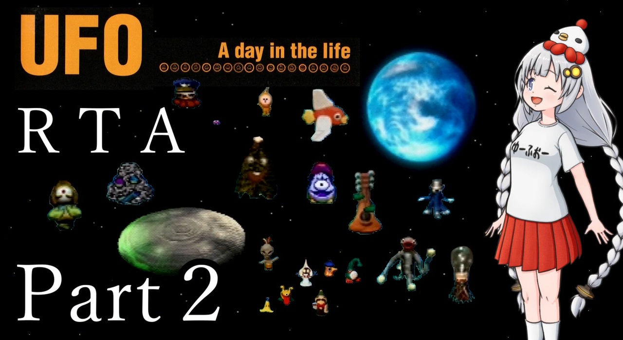 PlayStationゲーム「UFO -A day in the life-」RTAです。<br>個性的な宇宙人達と個性的な住人達の一日を楽しんでもらえると嬉しいです。<br><br>前:<a href="https://www.nicovideo.jp/watch/sm43450598" class="watch">sm43450598</a><br>次:<a href="https://www.nicovideo.jp/watch/sm43455468" class="watch">sm43455468</a><br><br>■計測区間<br>「はじめましてを選択」から「UFO帰還後の暗転」まで<br><br>■動画作成にあたり<br>・あかりちゃんイラスト<br>mobushiさん:<a href="https://twitter.com/mobushi" target="_blank" rel="noopener nofollow">https://twitter.com/mobushi</a><br>・音声ソフト<br>VOICEROID2 紲星あかり<br><br>■全編ぶっ通し(無編集)<br><a href="https://youtu.be/HTaZszMwxQA" target="_blank" rel="noopener nofollow">https://youtu.be/HTaZszMwxQA</a><br><br>■X(Twitter)<br>やまのひ:<a href="https://twitter.com/bergtag0811" target="_blank" rel="noopener nofollow">https://twitter.com/bergtag0811</a><br>