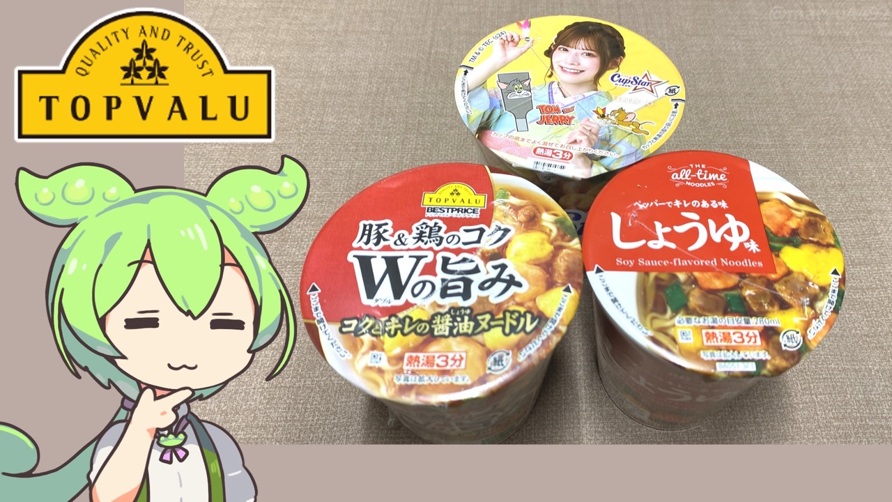 黄トプバと隠れトプバのしょうゆヌードルの実力はどれほどでしょうか?<br><br><br>【参考】<br>※黄トプバ:豚&鶏のコク Wの旨みコクとキレのしょうゆヌードル(トップバリュ)<br><a href="https://www.topvalu.net/items/detail/4549414361704/" target="_blank" rel="noopener nofollow">https://www.topvalu.net/items/detail/4549414361704/</a><br>※隠れトプバ:オールタイムヌードルヌードルしょうゆ味(トップバリュ)<br><a href="https://www.topvalu.net/items/detail/4549414548051/" target="_blank" rel="noopener nofollow">https://www.topvalu.net/items/detail/4549414548051/</a><br>カップスター(サンヨー食品株式会社)<br><a href="https://cupstar.jp/" target="_blank" rel="noopener nofollow">https://cupstar.jp/</a><br><br>【使用した素材】(※敬称略)<br>(合成音声)VOICEVOX/ずんだもん/四国めたん<br><a href="https://voicevox.hiroshiba.jp/" target="_blank" rel="noopener nofollow">https://voicevox.hiroshiba.jp/</a><br>(立ち絵)坂本アヒル<br><a href="https://seiga.nicovideo.jp/seiga/im10788496" target="_blank" rel="noopener">im10788496</a>/<a href="https://seiga.nicovideo.jp/seiga/im10791276" target="_blank" rel="noopener">im10791276</a><br>(楽曲)甘茶の音楽工房/「楽しい麦畑」<br><a href="https://amachamusic.chagasi.com/" target="_blank" rel="noopener nofollow">https://amachamusic.chagasi.com/</a>