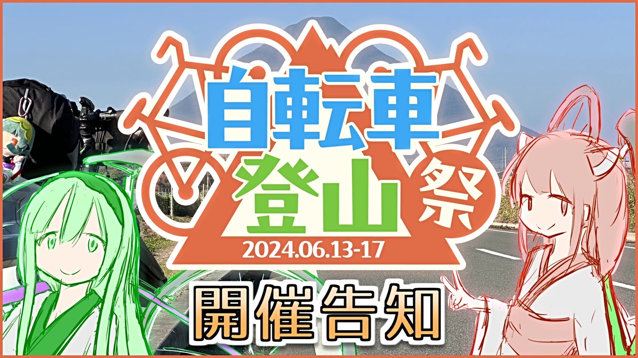 <span style="color: #ff0000;">ニコニコのメンテナンスに伴い、自転車登山祭 for ニコニコ の開催期間は<br>2024年8月5日(月)~18日(日)<br>に変更になりました!</span><br><br><span style="font-size: 16px;">自転車と登山に関する作品の投稿祭、『自転車登山祭』を開催します!<br>皆さまのご参加、お待ちしております!!</span><br><br><span style="font-size: 16px;">5/17 補足動画投稿しました! → <a href="https://www.nicovideo.jp/watch/sm43799435" class="watch">sm43799435</a></span><br><br>~~~自転車登山祭 開催概要~~~<br><br>【開催期間】<br>2024年6月13日(木)~8月18日(日)<br><br>【レギュレーション】<br>1. 自転車要素があること<br>2. 登山要素があること<br>3. 全力で楽しむ!!! ← 最重要<br><br>【参加形態】<br>1. ニコニコ動画への動画の投稿<br>2. ニコニコ静画への静画の投稿<br>3. Twitterでのツイート<br><br>【ロゴ】<br>配布先:<a href="https://commons.nicovideo.jp/works/nc354236" target="_blank" rel="noopener">nc354236</a><br>作者:しろまる。様 <a href="https://www.nicovideo.jp/user/24151806" target="_blank" rel="noopener">user/24151806</a><br><br>【参加動画マイリスト】<br>フライング・遅刻 → <a href="https://www.nicovideo.jp/mylist/76452278" target="_blank" rel="noopener">mylist/76452278</a><br>本祭 → <a href="https://www.nicovideo.jp/mylist/76849831" target="_blank" rel="noopener">mylist/76849831</a><br><br>【参考】<br>自転車登山マイリスト → <a href="https://www.nicovideo.jp/mylist/68763195" target="_blank" rel="noopener">mylist/68763195</a><br>ホバー動画マイリスト → <a href="https://www.nicovideo.jp/mylist/73907804" target="_blank" rel="noopener">mylist/73907804</a><br>ソフトウェアトーク動画追走祭 告知動画 → <a href="https://www.nicovideo.jp/watch/sm43234697" class="watch">sm43234697</a><br>ニコニコ登山祭 → <a href="https://www.nicovideo.jp/watch/sm43337231" class="watch">sm43337231</a><br><br>【開催概要(詳細版)】<br><a href="https://docs.google.com/document/d/1wOMxoPsBr6CrxTmRGw2SuBg8UCMb8E88BI3uDTfGL_g/edit?usp=sharing" target="_blank" rel="noopener nofollow">https://docs.google.com/document/d/1wOMxoPsBr6CrxTmRGw2SuBg8UCMb8E88BI3uDTfGL_g/edit?usp=sharing</a><br><br>【お問合せ先】<br>Twitterの @Cycle_Climbing または @nanary_RTA までお気軽にどうぞ!<br>質問などは本動画へのコメントでも大丈夫です!<br><br>~~~~~~<br><br>初めましての方は初めまして!nanaryです!<br>普段は「自転車」や「登山」や「自転車の登山」の動画を投稿しています!<br>◇前の動画 → 薬師岳100%RTA/<a href="https://www.nicovideo.jp/watch/sm43370792" class="watch">sm43370792</a><br>◇次の動画 → 志摩ゆるポタ/<a href="https://www.nicovideo.jp/watch/sm43562310" class="watch">sm43562310</a><br>◇北海道一周RTAもよろしく!! → part1/<a href="https://www.nicovideo.jp/watch/sm40215086" class="watch">sm40215086</a><br>◇私の全投稿動画 → <u><a href="https://www.nicovideo.jp/mylist/68042003" target="_blank" rel="noopener">mylist/68042003</a></u>