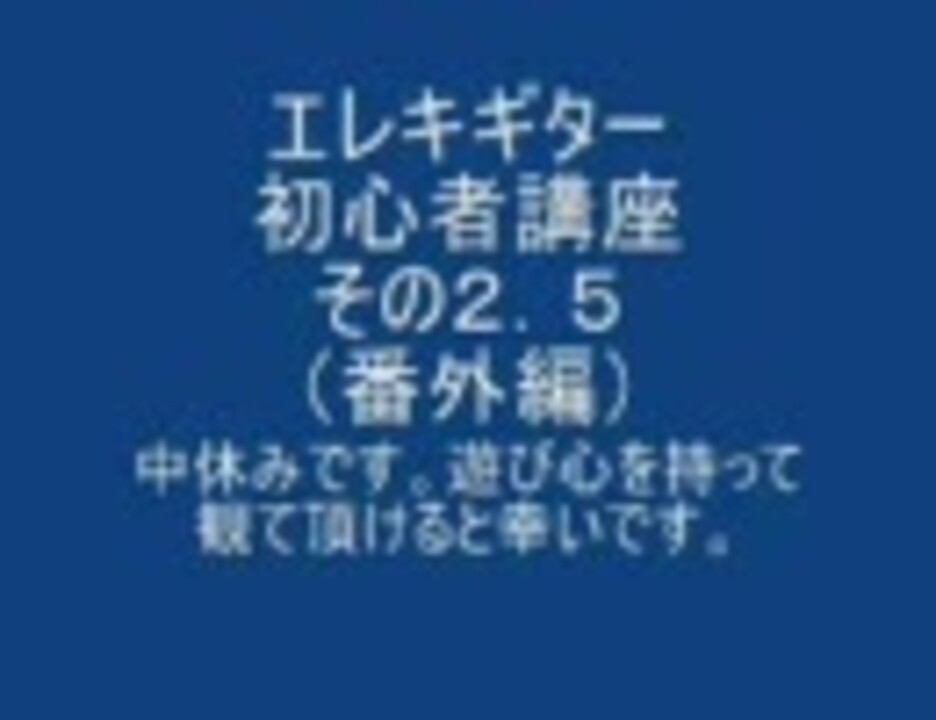 自分の初心を思い出すために。ニコニコ動画を見てギターを始めたい!って思った人向けに初心者講座を作ってみた、その2,5(番外編)です。・・・途中休憩?っていうか、僕自身、あまり時間が作れなかったがため、小ネタ的動画なので、2,5です。 いつもよりは短い動画になってますが、最後までお付き合い頂けると幸いです。 では、どうぞ!その2→/<a href="https://www.nicovideo.jp/watch/sm4316137" class="watch">sm4316137</a> その3→/<a href="https://www.nicovideo.jp/watch/sm4407787" class="watch">sm4407787</a> 他の作品は→/<a href="https://www.nicovideo.jp/mylist/4702862" target="_blank" rel="noopener">mylist/4702862</a> ブログ→<a href="http://ameblo.jp/kenzysan/" target="_blank" rel="noopener nofollow">http://ameblo.jp/kenzysan/</a> twitter @Kenzysan