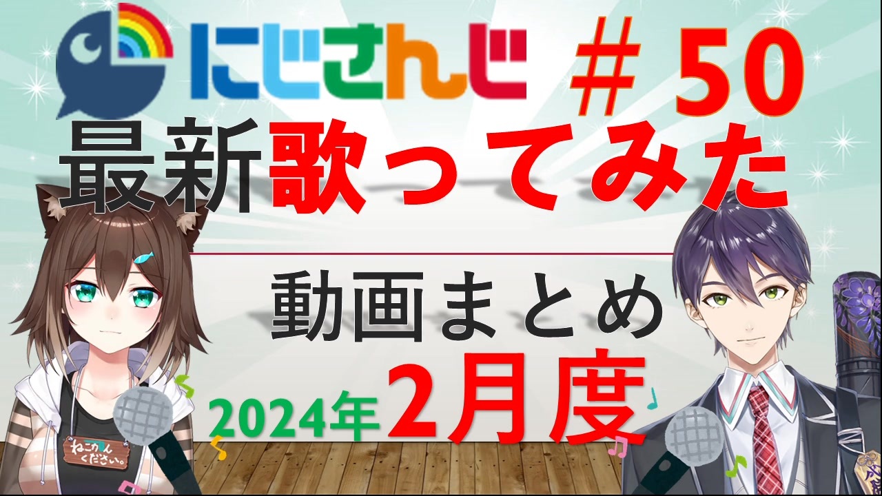 <span style="color: #00ff00;">◆</span>期間:2024年2月1日~2月29日<br><span style="color: #00ff00;">◆</span>対象:にじさんじライバーによる歌ってみた動画<br><span style="font-size: 10px;">(にじさんじのみ対象。JP・元ID・元KR・EN)</span><br><span style="color: #00ff00;">◆</span><span style="color: #262626;">参考サイト:(</span><span style="color: #262626;"><strong>↓元動画はこのページからご参照ください↓</strong></span><span style="color: #262626;">)</span><br>VMusic Ch. 様<br><a href="https://music.vtuber-ch.com/?gname=にじさんじALL" target="_blank" rel="noopener nofollow">https://music.vtuber-ch.com/?gname=にじさんじALL</a><br>にじさんじ非公式Wiki 様<br><a href="https://wikiwiki.jp/nijisanji/歌唱まとめ" target="_blank" rel="noopener nofollow">https://wikiwiki.jp/nijisanji/歌唱まとめ</a><br><br>前回(1月)の歌みたまとめ:<a href="https://www.nicovideo.jp/watch/sm43346902" class="watch">sm43346902</a><br>年間歌ってみたまとめ:<a href="https://www.nicovideo.jp/watch/sm43265696" class="watch">sm43265696</a><br><br>プレイリストは上記非公式Wiki内のプレイリストをご活用ください。<br>気になる歌動画を見つけたらぜひ、元動画をご覧ください!!<br><br>よく確認はしましたが、抜けがありましたらコメントをお願いいたします。<br><br>うp主、3月1日~3日で志摩スペイン村に行っているため、訂正等があった場合訂正が遅れますことを、あらかじめ申し上げておきます。