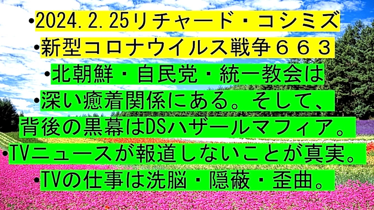 <span style="color: #cc4125;"><strong>「 テーマ : 新型コロナウイルス戦争 663 」</strong></span><br><br><span style="color: #ff0000;"><strong>「『 北朝鮮 』・『 自民党 』・『 統一教会 』は、『 深い癒着関係 』にある。そして、『 背後の黒幕 』は<br> 『 DEEP STATE ハザールマフィア 』。『 TVニュース 』が『 報道しない 』ことが『 真実 』。『 TVの<br> 仕事 』は『 洗脳 』・『 隠蔽 』・『 歪曲 』」</strong></span><br><br> <span style="color: #0000ff;"><strong>◐『 イベルメクチン・アビガン服用後 』の体験談等をお寄せ下さい。RK</strong></span><br> <span style="color: #0000ff;"><strong>E-mail : richardkoshimizu@gmail.com</strong></span><br><br> <span style="color: #38761d;"><strong>◐ リチャード・コシミズ・チャンネル『⦅ ニコニコ チャンネル ⦆』</strong></span><br> <span style="color: #38761d;"><strong><a href="https://ch.nicovideo.jp/richardkoshimizu" target="_blank" rel="noopener nofollow">https://ch.nicovideo.jp/richardkoshimizu</a><br><br> ◐ リチャード・コシミズ『 ニコニコ生放送⦅ LIVE ⦆』</strong></span><br> <span style="color: #38761d;"><strong><a href="https://www.nicovideo.jp/user/120930363/live_programs" target="_blank" rel="noopener nofollow">https://www.nicovideo.jp/user/120930363/live_programs</a><br><br> ◐ リチャード・コシミズ『 Rumble 』公式 動画ギャラリー</strong></span><br> <span style="color: #38761d;"><strong><a href="https://rumble.com/user/richardkoshimizu" target="_blank" rel="noopener nofollow">https://rumble.com/user/richardkoshimizu</a></strong></span><br><br> <span style="color: #38761d;"><strong>◐ リチャード・コシミズ『 ニコニコ動画⦅ 全動画 ⦆』公式 動画ギャラリー</strong></span><br> <span style="color: #38761d;"><strong><a href="https://www.nicovideo.jp/user/121957117/video" target="_blank" rel="noopener nofollow">https://www.nicovideo.jp/user/121957117/video</a></strong></span><br><br>