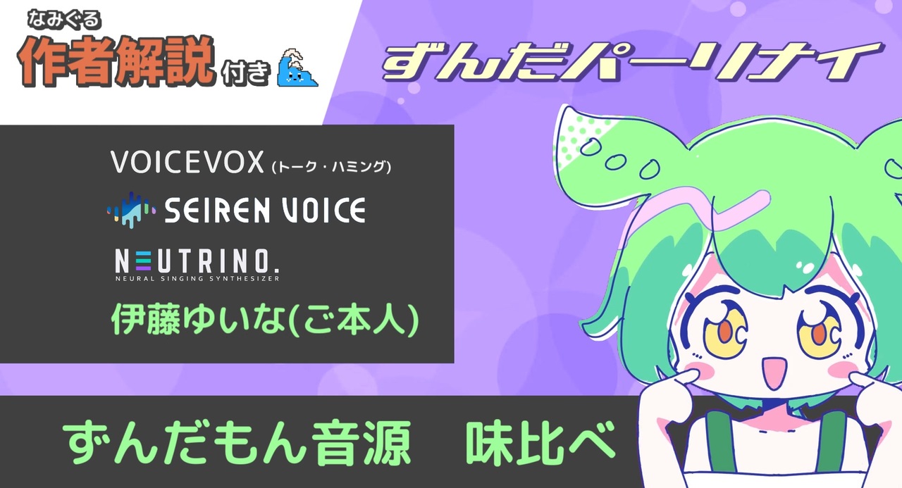 ずんだもん音源をずんだパーリナイ作者本人が味比べ!<br>伊藤ゆいな様本人歌唱も聴けるよ!<br><br>■利用ソフト<br>◆VOICEVOX(無償)<br><a href="https://voicevox.hiroshiba.jp/" target="_blank" rel="noopener nofollow">https://voicevox.hiroshiba.jp/</a><br><br>◆Seiren Voice(有償)<br><a href="https://seiren-voice.dmv.nico/" target="_blank" rel="noopener nofollow">https://seiren-voice.dmv.nico/</a><br><br>◆NEUTRINO(無償)<br><a href="https://studio-neutrino.com/" target="_blank" rel="noopener nofollow">https://studio-neutrino.com/</a><br><br>■制作協力<br>◆伊藤ゆいな様<br>◆SSS合同会社様<br>◆VOICEVOXヒホ様<br><br>■音源<br>◆サブスク配信<br><a href="https://nex-tone.link/A00115058" target="_blank" rel="noopener nofollow">https://nex-tone.link/A00115058</a><br><br>◆Booth<br><a href="https://booth.pm/ja/items/4846910" target="_blank" rel="noopener nofollow">https://booth.pm/ja/items/4846910</a><br><br>◆Bandcamp<br><a href="https://namigroove.bandcamp.com/album/--4" target="_blank" rel="noopener nofollow">https://namigroove.bandcamp.com/album/--4</a><br><br>◆ずんだパーリナイ本人歌唱CD通販 <br>(シングル売り切れの代わりに、アルバム化しました) <a href="https://shop.zunko.jp/collections/%E9%9F%B3%E6%A5%BD/products/cd-%E3%81%9A%E3%82%93%E3%81%A0%E3%82%82%E3%82%93%E3%81%AE%E3%83%95%E3%82%A1%E3%83%BC%E3%82%B9%E3%83%88%E3%82%A2%E3%83%AB%E3%83%90%E3%83%A0%E3%81%AA%E3%81%AE%E3%81%A0" target="_blank" rel="noopener nofollow">https://shop.zunko.jp/collections/%E9%9F%B3%E6%A5%BD/products/cd-%E3%81%9A%E3%82%93%E3%81%A0%E3%82%82%E3%82%93%E3%81%AE%E3%83%95%E3%82%A1%E3%83%BC%E3%82%B9%E3%83%88%E3%82%A2%E3%83%AB%E3%83%90%E3%83%A0%E3%81%AA%E3%81%AE%E3%81%A0</a><br><br>◆Music&Lyrics&Movie:なみぐる ( <a href="https://twitter.com/namigroove" target="_blank" rel="noopener nofollow">https://twitter.com/namigroove</a> )<br>