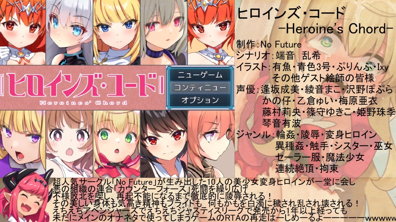 <span style="color: #ff0000; font-size: 24px;">よしんば私が世界2位だとしたら?<br>世界、1位です。</span><br><br><br><span style="font-size: 18px;">という訳で、記録を更新してきました!<br>前回のチャートからの改善点、そして何より<br>この1年間のNo Future様の活動を踏まえた実況をお楽しみください!</span><br><br><br>いいね!⇒今日の俳句<br><br><br><br>ストーリー<br>魔法少女とエビルズアークの戦いや、オムニサイドの襲撃を経て、戦うヒロイン達の存在は、広く世間に認知されていた。<br>民衆の多くは彼女たちを称賛していたが、彼女たちの存在を疎ましく思う組織や、彼女たちに劣情を抱く人も存在していた。<br><br>ヒロインに敵対する者達が共同で出資し、対ヒロイン傭兵部隊〝カウンター・フォース〟が設立された。<br>出資者の中には、悪の秘密組織シャルダークや、妖魔に支配された企業グロードも含まれていた。<br><br>〝カウンター・フォース〟は街中で破壊活動を行い、ヒロインをおびき出そうとする。<br>強大な力を持つ敵を前に、ヒロイン達は力を合わせて立ち向かう!<br><br><br>No FutureバースのRTA動画<br>「魔法少女ノーブル・ローズ」(全3本)→<a href="https://www.nicovideo.jp/mylist/72027465" target="_blank" rel="noopener">mylist/72027465</a><br>「念動少女セーラースプレンダー」(全5本)→<a href="https://www.nicovideo.jp/mylist/71453605" target="_blank" rel="noopener">mylist/71453605</a><br>「祓魔少女シャルロット」(全10本)→<a href="https://www.nicovideo.jp/mylist/71433234" target="_blank" rel="noopener">mylist/71433234</a><br>「ヒロインズ・コード」(全11本)→<a href="https://www.nicovideo.jp/mylist/74167615" target="_blank" rel="noopener">mylist/74167615</a><br>「テンタクル・プリズン」(全4本)→<a href="https://www.nicovideo.jp/mylist/76238045" target="_blank" rel="noopener">mylist/76238045</a><br><br><br>Twitter ID→@Duce_Ishizawa