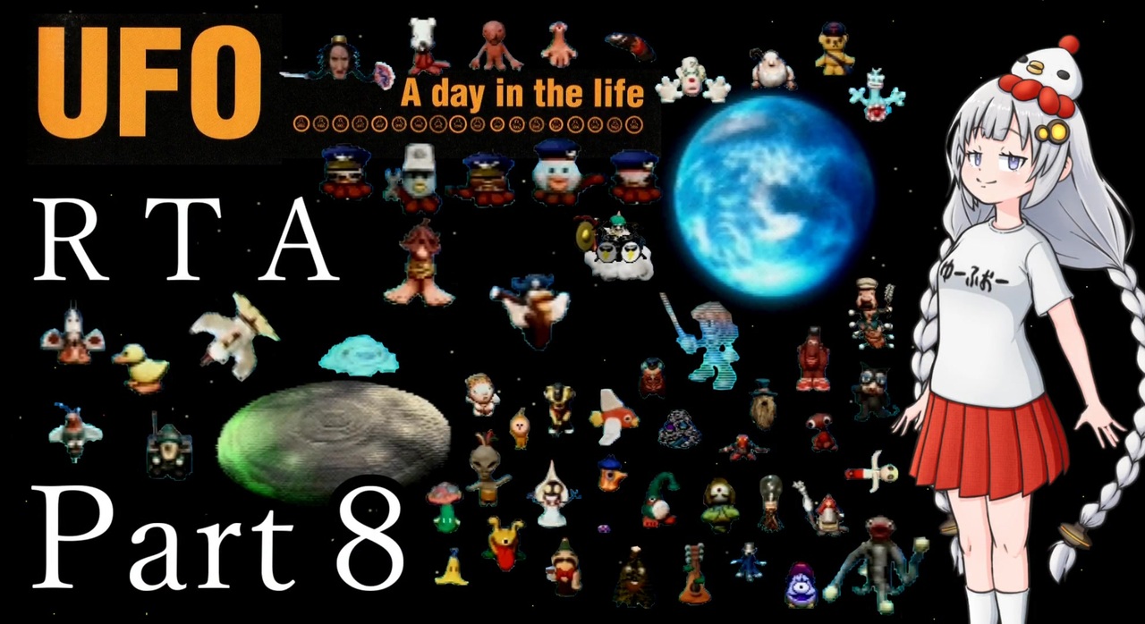 PlayStationゲーム「UFO -A day in the life-」RTAです。<br>個性的な宇宙人達と個性的な住人達の一日を楽しんでもらえると嬉しいです。<br><br>前:<a href="https://www.nicovideo.jp/watch/sm43464683" class="watch">sm43464683</a><br>次:<a href="https://www.nicovideo.jp/watch/sm43477781" class="watch">sm43477781</a><br><br>■計測区間<br>「はじめましてを選択」から「UFO帰還後の暗転」まで<br><br>■動画作成にあたり<br>・あかりちゃんイラスト<br>mobushiさん:<a href="https://twitter.com/mobushi" target="_blank" rel="noopener nofollow">https://twitter.com/mobushi</a><br>・音声ソフト<br>VOICEROID2 紲星あかり<br><br>■全編ぶっ通し(無編集)<br><a href="https://youtu.be/HTaZszMwxQA" target="_blank" rel="noopener nofollow">https://youtu.be/HTaZszMwxQA</a><br><br>■X(Twitter)<br>やまのひ:<a href="https://twitter.com/bergtag0811" target="_blank" rel="noopener nofollow">https://twitter.com/bergtag0811</a><br>