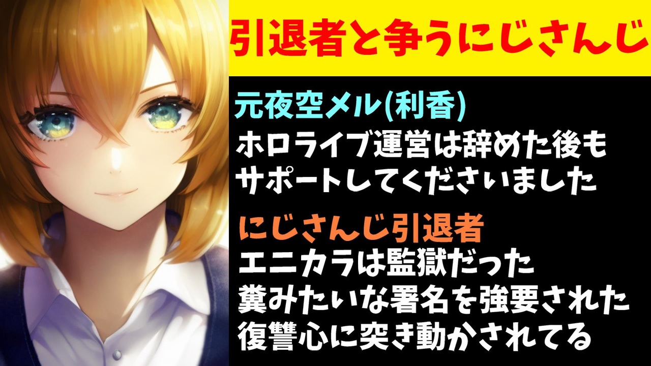 2024年3月2日、ホロライブを契約解除となった夜空メルこと利香さんが復帰配信を行われたのですが、彼女の口から出てきたホロライブ運営評が、にじさんじ引退者のそれとはあまりに違いすぎるとして話題になっています。<br><br>引用<br><a href="https://twitter.com/kuroneko_datenn/status/1763898045232824591" target="_blank" rel="noopener nofollow">https://twitter.com/kuroneko_datenn/status/1763898045232824591</a><br><br>Youtube <a href="https://www.youtube.com/@V_Virgin_Mary" target="_blank" rel="noopener nofollow">https://www.youtube.com/@V_Virgin_Mary</a><br>twitter <a href="https://twitter.com/V_Virgin_Mary" target="_blank" rel="noopener nofollow">https://twitter.com/V_Virgin_Mary</a><br><br>使用素材<br>高品質なフリー動画素材 - Pixabay <a href="https://pixabay.com/ja/videos" target="_blank" rel="noopener nofollow">https://pixabay.com/ja/videos</a><br><br>#Dokibrid #Selen #nijisanji #nijisanji_en #nijisanjien #vtuber #vtubers
