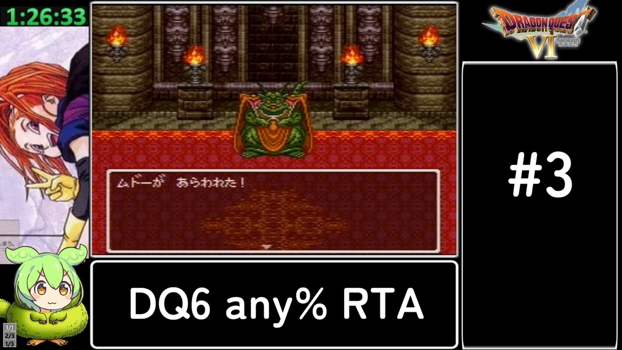 SFC版 DQ6 最速でクリアするぞい。<br>状況再現使います。<br><br>前:<a href="https://www.nicovideo.jp/watch/sm43336314" class="watch">sm43336314</a><br>次:まだ<br><br>YouTube版:<a href="https://youtu.be/e89WJmj-5Qw" target="_blank" rel="noopener nofollow">https://youtu.be/e89WJmj-5Qw</a><br>配信アーカイブ:<a href="https://youtube.com/live/Vmky3DXMi7g" target="_blank" rel="noopener nofollow">https://youtube.com/live/Vmky3DXMi7g</a><br><br>チャートはこちら<a href="https://eiki-rta-tas.blogspot.com/2024/01/sfcdq6rta.html" target="_blank" rel="noopener nofollow">https://eiki-rta-tas.blogspot.com/2024/01/sfcdq6rta.html</a><br><br>【TAS】DQ6ダークドレアム撃破END: <a href="https://www.nicovideo.jp/series/350095" target="_blank" rel="noopener nofollow">https://www.nicovideo.jp/series/350095</a><br>Twitter のフォローお願いします!<br><a href="https://twitter.com/eikyudai" target="_blank" rel="noopener nofollow">https://twitter.com/eikyudai</a><br><br>VOICEVOX:ずんだもん<br>ネタバレあり<br>この動画で利用している株式会社スクウェア・エニックスを代表とする共同著作者が権利を所有する著作物及びスギヤマ工房有限会社が権利を所有する楽曲の転載・配布は禁止いたします。<br>© 1995 ARMOR PROJECT/BIRD STUDIO/HEART BEAT/SQUARE ENIX All Rights Reserved.<br>© SUGIYAMA KOBO