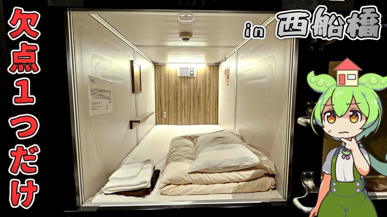 ★今回宿泊したお宿「レオ癒カプセルホテル」<br>公式:<a href="https://leo-capsule.jp/" target="_blank" rel="noopener nofollow">https://leo-capsule.jp/</a><br><br>何故だ・・・なぜ・・・西船橋・・・栄えない・・・ッ!!<br>(誰か知ってたら教えてください)<br><br>▼お借りした素材・ソフト<br>【立ち絵】<br>・坂本アヒル様<br><a href="https://seiga.nicovideo.jp/user/illust/97452727" target="_blank" rel="noopener nofollow">https://seiga.nicovideo.jp/user/illust/97452727</a><br><br>【合成音声】<br>・VOICEBOX:<a href="https://voicevox.hiroshiba.jp/" target="_blank" rel="noopener nofollow">https://voicevox.hiroshiba.jp/</a><br> 使用ボイス:ずんだもん、四国めたん<br>・作者:hiho様:<a href="https://twitter.com/hiho_karuta" target="_blank" rel="noopener nofollow">https://twitter.com/hiho_karuta</a><br><br>【動画編集】<br>・ゆっくりムービーメーカー4:<a href="https://manjubox.net/ymm4/" target="_blank" rel="noopener nofollow">https://manjubox.net/ymm4/</a><br><br>★広告ありがとうございます!<br>イワナ男様、燃ユル終焉ヲ謳ウ翼様、yukito様、Goldilocks様、ネコ神様、DDM様、セリス様、sample000様、鳥がー様、ran様、mayele32様、きょん様、toro様、KAZUKiX様、ぶれくる様、putachan様、せんねん様、tamanegiman様、あああああ様、ジュキロ様、てく様、神音の社様、B747様、LOHENGRAMM様、三駒様、なゆ太郎様、イージェ様、ちびくろ参謀様、スプT様、もぷぷ様、シグナーサリー様、フウイ様、みー様、mitihiro様、CYPHA様、cani3124様、真剣蝉様、やげん軟骨様、やちゅう様、農協銀行様、ハリベル様、せっちん様、テラヤンマ様、ガチニート関根様、----様、Kenshiro様、ビントロング(くまねこ)様、フリードリヒ様、yukimachi様、osan様、shiita様、Sylen様、樽沢P様、mossy様、koukoku様、かぶ様、ハニダヨー様、ascom様、JDC様、ひさ様、神速の貴公子・澪先輩様、スフィン様、日向思考様、無ィ無様、surt様、よしりん様、ふるーてぃー様、にぱー様、imo様、katoppe様、茉理(matsuri)様、あたま様、しめさば様、ひこひこ様、ふみ様、furan339様、大道寺知世様、bolt様、kem様、kodomotoko様、ぶれくる様、エイルド様、omega34yu様、Arara様、ルリ様、akaki様、ハク兄さん様、OXA様、tokai200x様、JOPON様、gigi様、go1様、r2b様、コントレイル様、藜様、ガタ吉様、陽炎美影様、めりけん様、水陸両用野良ルンバ様、布都ちゃん様、ポンポコダケ様、ama様、フリー素材あそび様、夏冬春秋様、よじろ様、戦からこんにちわ様、けるび様(以下文字数…<br><br>★ギフトありがとうございます!<br>はたはた様