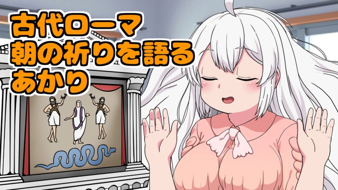 古代ローマ文明を勉強しているぽっちゃり大学生、紲星あかりのお話。<br>今日は古代ローマ 朝の祈りを語ります。<br><br>立ち絵素材<br>■紲星あかり 戸隠スバル様<a href="https://seiga.nicovideo.jp/seiga/im11334387" target="_blank" rel="noopener">im11334387</a><br>■琴葉姉妹 こーすけさんたまりあ様<a href="https://seiga.nicovideo.jp/seiga/im10027574" target="_blank" rel="noopener">im10027574</a><br><br>参考文献(二次資料)<br>■K=W・ヴェーバー著、小竹澄栄訳『古代ローマ生活事典』<br>■レスリー・アドキンズ/レイ・A・アドキンズ著、前田耕作訳『ローマ宗教文化事典』<br><br>参考文献(一次資料)<br>■プラウトゥス著、五之治昌比呂訳『ローマ喜劇集1 黄金の壺』<br>■プラウトゥス著、木村健治訳『ローマ喜劇集3 商人』<br>■プラウトゥス著、木村健治訳『ローマ喜劇集3 ほら吹き兵士』<br>■プラウトゥス著、上村健二訳『ローマ喜劇集4 商人』<br><br>参考HP<br>■<a href="https://www.perseus.tufts.edu/hopper/" target="_blank" rel="noopener nofollow">https://www.perseus.tufts.edu/hopper/</a><br>■<a href="https://pompeiiinpictures.com/pompeiiinpictures/" target="_blank" rel="noopener nofollow">https://pompeiiinpictures.com/pompeiiinpictures/</a><br><br>BGM 素材<br>■無印良品 BGM9 Naples<br>■Synaulia<br>■ニコニコモンズ コールドフィッシュ<a href="https://commons.nicovideo.jp/works/nc105909" target="_blank" rel="noopener">nc105909</a><br>