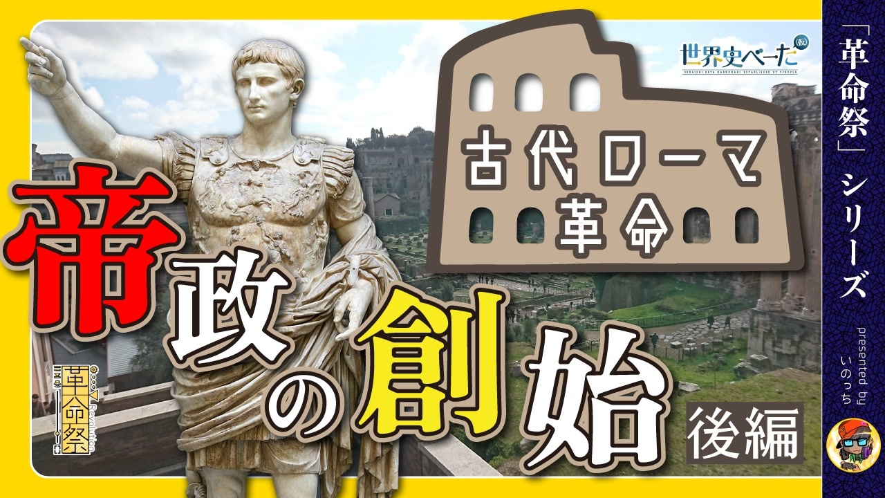 イギリスの歴史学者「ロナルド・サイム」は、アウグストゥスに代表されるイタリア人や騎士階級の台頭とそれに伴う伝統的なノビレスによる寡頭支配体制の崩壊を「ローマ革命」と主張しました。<br> <br>そのような学説も踏まえながら、アウグストゥスが成立させた「帝政」の実状を簡単に観ていきます!<br><br><br>【参考文献】<br>青柳正規(2004)『ローマ帝国』岩波書店<br>バーバラ・レヴィック(2020)『アウグストゥス 虚像と実像』法政大学出版局<br>比佐篤(2018)『貨幣が語る ローマ帝国史』中公新書<br>メアリー・ビアード(2018)『SPQR ローマ帝国史Ⅰ 共和政の時代』亜紀書房<br>本村凌二(2018)『教養としての「ローマ史」の読み方』PHP研究所<br>ロナルド・サイム(2013)『ローマ革命(上)』岩波書店<br>ロナルド・サイム(2013)『ローマ革命(下)』岩波書店<br><br>●前編:<a href="https://www.nicovideo.jp/watch/sm43252170" class="watch">sm43252170</a><br>●革命祭マイリスト:<a href="https://www.nicovideo.jp/mylist/76119080" target="_blank" rel="noopener">mylist/76119080</a><br>●革命祭公式HP:<a href="https://sekaishi-beta.com/revolution/" target="_blank" rel="noopener nofollow">https://sekaishi-beta.com/revolution/</a><br><br>●いのっちコミュニティ co3096574<br>●いのっち@えっくす(ついったー) <a href="https://twitter.com/inocchi_0515" target="_blank" rel="noopener nofollow">https://twitter.com/inocchi_0515</a><br>●<span style="color: #262626;">いのっちHP! </span><a href="https://inocchi-douga.com/" target="_blank" rel="noopener nofollow">https://inocchi-douga.com/</a><br><br>●世界史べーた(仮)ニコニコ転載動画マイリスト <a href="https://www.nicovideo.jp/mylist/72650162" target="_blank" rel="noopener">mylist/72650162</a><br>●公式X(Twitter)アカウント <a href="https://twitter.com/sekaishibeta" target="_blank" rel="noopener nofollow">https://twitter.com/sekaishibeta</a><br>●公式HP <a href="https://sekaishi-beta.com/" target="_blank" rel="noopener nofollow">https://sekaishi-beta.com/</a><br><br><a target="_blank" href="https://qa.nicovideo.jp/faq/show/19424?site_domain=default" style="font-size: 13px;color: #657586; text-decoration: underline; line-height: 1.4">この動画は投稿者によって修正されました</a>
