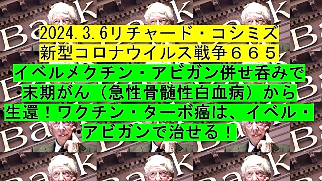 <span style="color: #cc4125;"><strong>「 テーマ : 新型コロナウイルス戦争 665 」</strong></span><br><br><span style="color: #ff0000;"><strong>「『 イベルメクチン・アビガン 併せ呑み 』で、『 末期がん( 急性骨髄性白血病 )』から生還!<br> 『 ワクチン・ターボ癌 』は、『 イベルメクチン・アビガン 』で『 治せる!』」</strong></span><br><br> <span style="color: #0000ff;"><strong>◐『 イベルメクチン・アビガン服用後 』の体験談等をお寄せ下さい。RK</strong></span><br> <span style="color: #0000ff;"><strong>E-mail : richardkoshimizu@gmail.com</strong></span><br><br> <span style="color: #38761d;"><strong>◐ リチャード・コシミズ・チャンネル『⦅ ニコニコ チャンネル ⦆』</strong></span><br> <span style="color: #38761d;"><strong><a href="https://ch.nicovideo.jp/richardkoshimizu" target="_blank" rel="noopener nofollow">https://ch.nicovideo.jp/richardkoshimizu</a><br><br> ◐ リチャード・コシミズ『 ニコニコ生放送⦅ LIVE ⦆』</strong></span><br> <span style="color: #38761d;"><strong><a href="https://www.nicovideo.jp/user/120930363/live_programs" target="_blank" rel="noopener nofollow">https://www.nicovideo.jp/user/120930363/live_programs</a><br><br> ◐ リチャード・コシミズ『 Rumble 』公式 動画ギャラリー</strong></span><br> <span style="color: #38761d;"><strong><a href="https://rumble.com/user/richardkoshimizu" target="_blank" rel="noopener nofollow">https://rumble.com/user/richardkoshimizu</a></strong></span><br><br> <span style="color: #38761d;"><strong>◐ リチャード・コシミズ『 ニコニコ動画⦅ 全動画 ⦆』公式 動画ギャラリー</strong></span><br> <span style="color: #38761d;"><strong><a href="https://www.nicovideo.jp/user/121957117/video" target="_blank" rel="noopener nofollow">https://www.nicovideo.jp/user/121957117/video</a></strong></span><br><br>