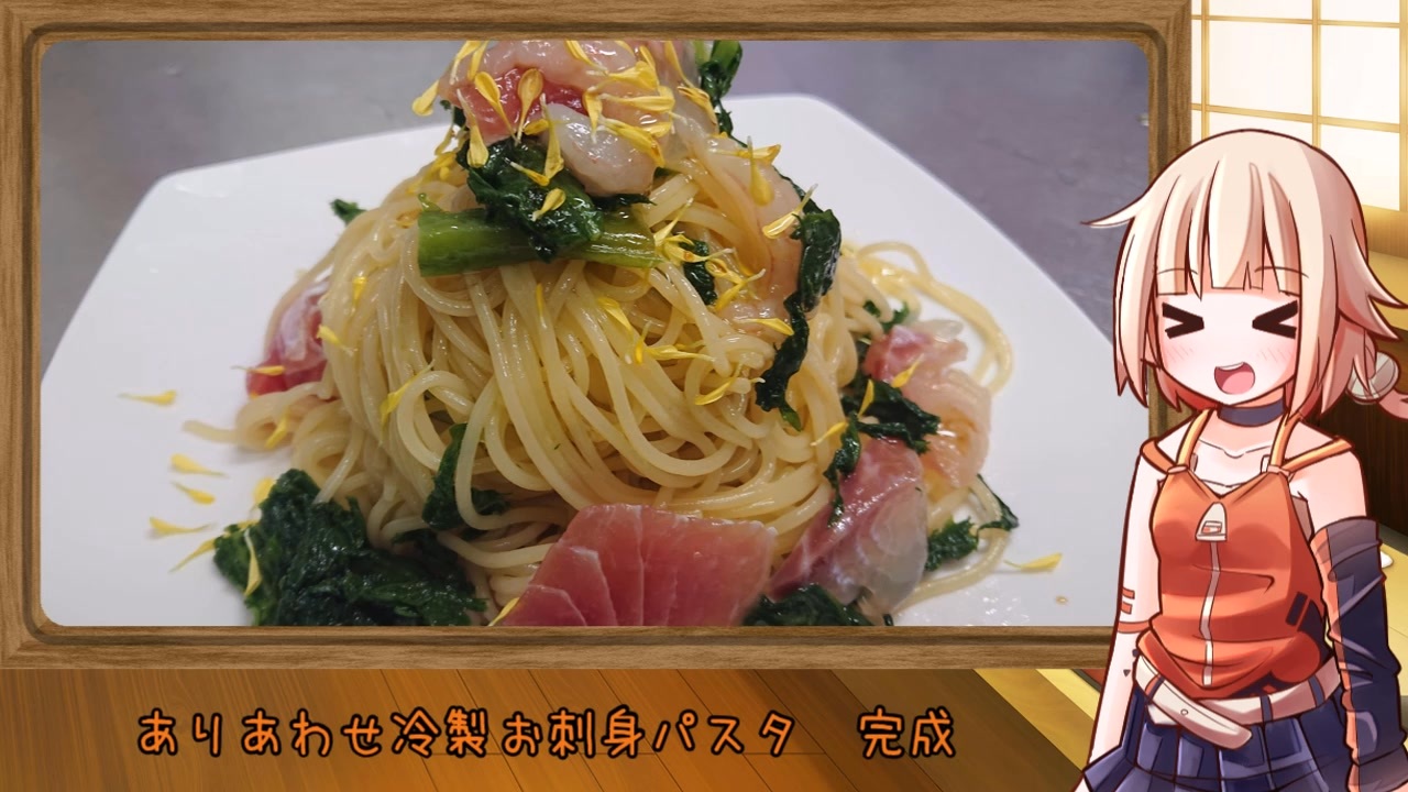 みなさんおはようございます<br>私がボイスロイド動画投稿はじめ今月で7年になりました<br>14歳が21歳になると思うとヤバイ時間ですね<br>正気に戻ると後悔しそうなんで現実から目を背けときます<br><br>今回わさび菜と鶏ささみでもしようと思ったんですが<br>お刺身安かったんでこっちなりました<br>お刺身パスタの詳しい作り方は過去動画で<br>→<a href="https://www.nicovideo.jp/watch/sm41442741" class="watch">sm41442741</a><br><br>次回未定ですがまったりお待ち頂けると幸いです<br>そろそろネタ切れなんで遅くなるかも<br><br>※ 本シリーズで紹介してる作り方はあくまで手軽に済ませる<br> 事を前提にした構成になっています<br> なのでガチ勢の方々は可愛いおねちゃん眺めててくださいな<br><br><br>なにかご要望や質問、干芋等あればTwitterまで<br>ツイッター @higanbananosaku
