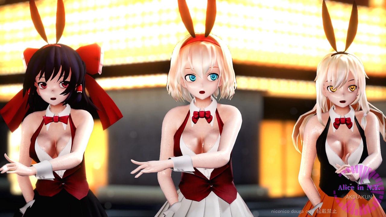 3人に踊ってもらいました。<br>現在、作成リクエストは受け付けていません。<br><br><br>【楽曲】:「Alice in N.Y.」:ひとしずく×やま△様 <a href="https://www.nicovideo.jp/watch/sm34903038" class="watch">sm34903038</a><br><a href="https://youtu.be/Rg5r1k-pZGU" target="_blank" rel="noopener nofollow">https://youtu.be/Rg5r1k-pZGU</a><br><br>【振付】:Agustin Kim 様<br><a href="https://youtu.be/IgNMWL64rpE" target="_blank" rel="noopener nofollow">https://youtu.be/IgNMWL64rpE</a><br><br>【モーション・カメラ】:tktk 様 <a href="https://www.nicovideo.jp/watch/sm43488007" class="watch">sm43488007</a><br><br><br>■スカイドーム<br>ゴールドナイト NN6:怪獣対若大将P 様 <a href="https://seiga.nicovideo.jp/seiga/im5559486" target="_blank" rel="noopener">im5559486</a><br><br>■ステージ<br>Stage03:那智様 <a href="https://www.nicovideo.jp/watch/sm36617320" class="watch">sm36617320</a><br>Stage36:那智様 <a href="https://www.nicovideo.jp/watch/sm37969637" class="watch">sm37969637</a><br>謎のラスベガス:つねかわ様 <a href="https://seiga.nicovideo.jp/seiga/im10933244" target="_blank" rel="noopener">im10933244</a><br>カジノ風ステージ&シャンデリア:ももじ様 <a href="https://seiga.nicovideo.jp/seiga/im10744917" target="_blank" rel="noopener">im10744917</a><br><br>■モデル<br>霊夢、魔理沙、アリス:にがもん様、しえら様<br>・衣装:アールビット様<br><br>■エフェクト<br>Ray-mmd-1.5.2:Rui様<br>初心者マテリアル:さらしな様<br>肌マテリアル:MARUSU様<br>AutoLuminous4:そぼろ様<br>水面エフェクト:ビームマンP様<br>空中に漂う埃:化身バレッタ様<br>ikBokeh_v020a:ikeno様<br><br><br>MikuMikuDance:樋口優様<br>MMEffect :舞力介入P様<br>PMDE、PmxE:極北P様<br>AviUtl :KENくん様<br>・Aviutl + x264guiExでエンコード:rigaya様<br>Ut Video Codec suite:ゆーむP様<br>上海アリス幻楽団・東方project(ZUN様)<br><br>黒兄貴様x5、tokai200x様、enii様、ゆうろえーす様x4、cz500c様x3、まさちち様x2、ゆきちお様x7、アルマク 鮎様x2、ゲルド様、rikikun様x2、tohjo様x4、ゆうろえーす様、cz500c様x2、ゆうろえーす様x4、ゆうろえーす様、ゆうろえーす様、ゆうろえーす様、またまたの広告ありがとうございます。(_ _)<br>ゆうろえーす様、cz500c様、多大な広告・@@・・・@@オオッ・・・ありがとうございます。(_ _)<br><br>mylist ③<a href="https://www.nicovideo.jp/mylist/75586824" target="_blank" rel="noopener">mylist/75586824</a> ② <a href="https://www.nicovideo.jp/mylist/72970530" target="_blank" rel="noopener">mylist/72970530</a> ① <a href="https://www.nicovideo.jp/mylist/63690967" target="_blank" rel="noopener">mylist/63690967</a> 旧 <a href="https://www.nicovideo.jp/mylist/61238351" target="_blank" rel="noopener">mylist/61238351</a><br><br> ※動画の転載は禁止です。<br>Attention,Unauthorized reproduction prohibited!!