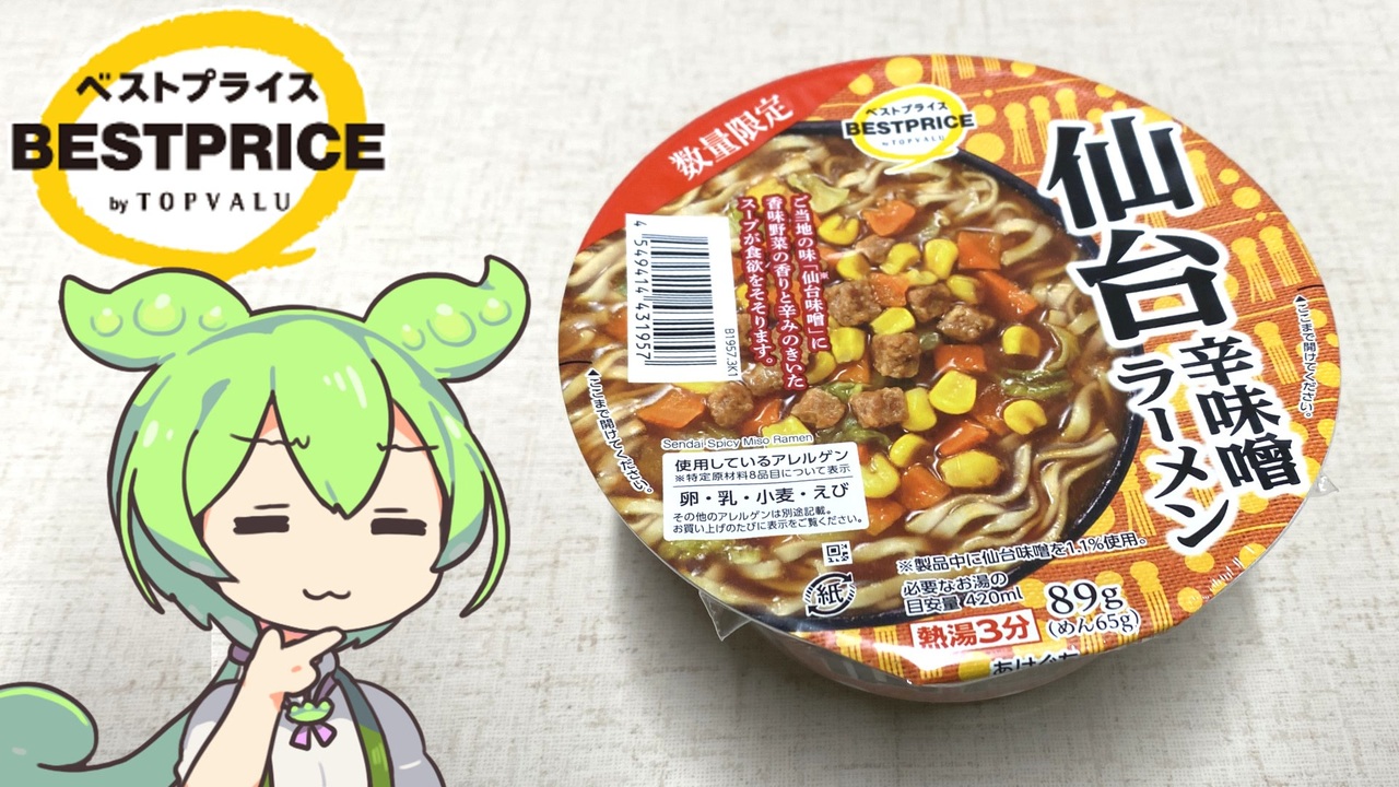2024年3月5日より数量限定で販売されている<br>仙台辛味噌ラーメン(カップラーメン)、どんな味なのでしょうか。<br><br><br>【参考】<br>「トップバリュベストプライス 東北ご当地カップ麺」新発売※PDFファイル(トップバリュ)<br><a href="https://aeontohoku.co.jp/company/uploads/News/news_20240304.pdf" target="_blank" rel="noopener nofollow">https://aeontohoku.co.jp/company/uploads/News/news_20240304.pdf</a><br>イオン、ご当地カップ麺シリーズから「福島なみえ焼そば」と「仙台辛味噌ラーメン」<br>発売トップバリュベストプライスで展開(食品産業新聞社)<br><a href="https://www.ssnp.co.jp/distribution/540051/" target="_blank" rel="noopener nofollow">https://www.ssnp.co.jp/distribution/540051/</a><br>営業拠点・生産工場・関連会社(明星食品)<br><a href="https://www.myojofoods.co.jp/about/branch/" target="_blank" rel="noopener nofollow">https://www.myojofoods.co.jp/about/branch/</a><br>みそのちから 赤味噌の代表仙台みそ(仙台味噌醤油株式会社)<br><a href="http://www.sendaimiso.co.jp/power/akamiso/" target="_blank" rel="noopener nofollow">http://www.sendaimiso.co.jp/power/akamiso/</a><br>仙台みそ 伊達政宗が広めた元祖・仙台グルメ(NHKアーカイブス)<br><a href="https://www2.nhk.or.jp/archives/movies/?id=D0004990982_00000" target="_blank" rel="noopener nofollow">https://www2.nhk.or.jp/archives/movies/?id=D0004990982_00000</a><br><br>【使用した素材】(※敬称略)<br>(合成音声)VOICEVOX/ずんだもん/四国めたん<br><a href="https://voicevox.hiroshiba.jp/" target="_blank" rel="noopener nofollow">https://voicevox.hiroshiba.jp/</a><br>(立ち絵)坂本アヒル<br><a href="https://seiga.nicovideo.jp/seiga/im10788496" target="_blank" rel="noopener">im10788496</a>/<a href="https://seiga.nicovideo.jp/seiga/im10791276" target="_blank" rel="noopener">im10791276</a><br>(楽曲)甘茶の音楽工房/「楽しい麦畑」「フルーツパフェ」「お城の舞踏会」<br><a href="https://amachamusic.chagasi.com/" target="_blank" rel="noopener nofollow">https://amachamusic.chagasi.com/</a>