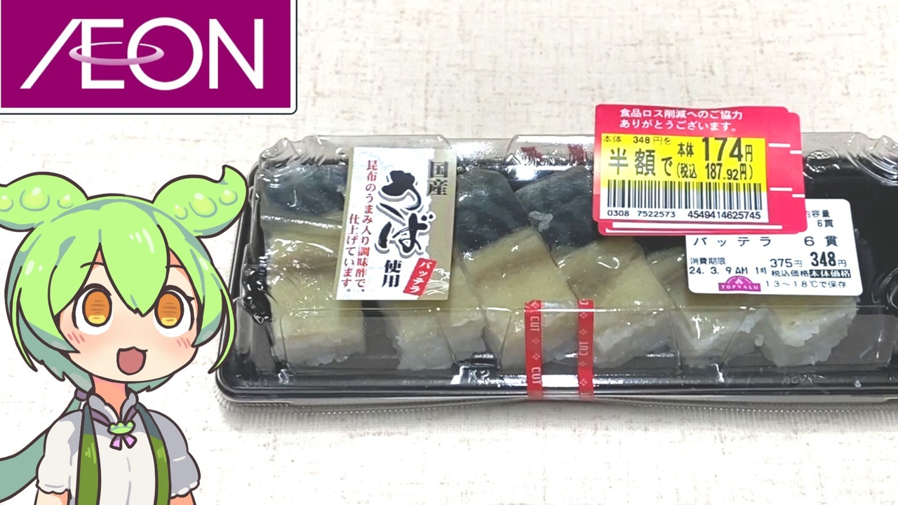 イオンで買いました。<br><br><br>【参考】<br>うちの郷土料理 大阪府 バッテラ(農林水産省)<br><a href="https://www.maff.go.jp/j/keikaku/syokubunka/k_ryouri/search_menu/menu/39_5_osaka.html" target="_blank" rel="noopener nofollow">https://www.maff.go.jp/j/keikaku/syokubunka/k_ryouri/search_menu/menu/39_5_osaka.html</a><br>サバ寿司をバッテラというのはなぜ?(食育大辞典)<br><a href="https://shokuiku-daijiten.com/mame/mame-1222/" target="_blank" rel="noopener nofollow">https://shokuiku-daijiten.com/mame/mame-1222/</a><br>FC大阪<br><a href="https://fc-osaka.com/" target="_blank" rel="noopener nofollow">https://fc-osaka.com/</a><br><br>【使用した素材】(※敬称略)<br>(合成音声)VOICEVOX/ずんだもん/四国めたん<br><a href="https://voicevox.hiroshiba.jp/" target="_blank" rel="noopener nofollow">https://voicevox.hiroshiba.jp/</a><br>(立ち絵)坂本アヒル<br><a href="https://seiga.nicovideo.jp/seiga/im10788496" target="_blank" rel="noopener">im10788496</a>/<a href="https://seiga.nicovideo.jp/seiga/im10791276" target="_blank" rel="noopener">im10791276</a><br>(楽曲)甘茶の音楽工房/「楽しい麦畑」「フルーツパフェ」「お城の舞踏会」<br><a href="https://amachamusic.chagasi.com/" target="_blank" rel="noopener nofollow">https://amachamusic.chagasi.com/</a>