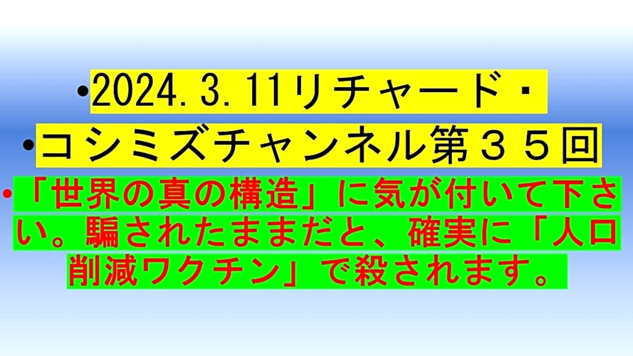 <span style="color: #ff0000;"><strong>「『 世界の真の構造 』に気が付いて下さい。『 騙されたまま 』だと、確実に『 人口削減ワクチン 』で<br> 『 殺されます 』」</strong></span><br><br><span style="color: #38761d;"><strong> ◐ リチャード・コシミズ・チャンネル⦅ ニコニコ チャンネル ⦆</strong></span><br> <span style="color: #38761d;"><strong><a href="https://ch.nicovideo.jp/richardkoshimizu" target="_blank" rel="noopener nofollow">https://ch.nicovideo.jp/richardkoshimizu</a></strong></span><br><br><span style="color: #38761d;"><strong> ◐ リチャード・コシミズ『 ニコニコ生放送⦅ LIVE ⦆』</strong></span> <br> <span style="color: #38761d;"><strong><a href="https://www.nicovideo.jp/user/120930363/live_programs" target="_blank" rel="noopener nofollow">https://www.nicovideo.jp/user/120930363/live_programs</a></strong></span><br><br><span style="color: #38761d;"><strong> ◐ リチャード・コシミズ『 Rumble 』公式 動画ギャラリー</strong></span><br> <span style="color: #38761d;"><strong><a href="https://rumble.com/user/richardkoshimizu" target="_blank" rel="noopener nofollow">https://rumble.com/user/richardkoshimizu</a></strong></span><br><br><span style="color: #38761d;"><strong> ◐ リチャード・コシミズ『 ニコニコ動画⦅ 全動画 ⦆』公式 動画ギャラリー</strong></span><br> <span style="color: #38761d;"><strong><a href="https://www.nicovideo.jp/user/121957117/video" target="_blank" rel="noopener nofollow">https://www.nicovideo.jp/user/121957117/video</a></strong></span><br> <br><span style="color: #38761d;"><strong> ◐ リチャード・コシミズ『 ニコニコ動画⦅ 333 ~ ⦆』公式 動画ギャラリー</strong></span><br> <span style="color: #38761d;"><strong><a href="https://www.nicovideo.jp/user/121028600/video" target="_blank" rel="noopener nofollow">https://www.nicovideo.jp/user/121028600/video</a></strong></span><br><br><br>