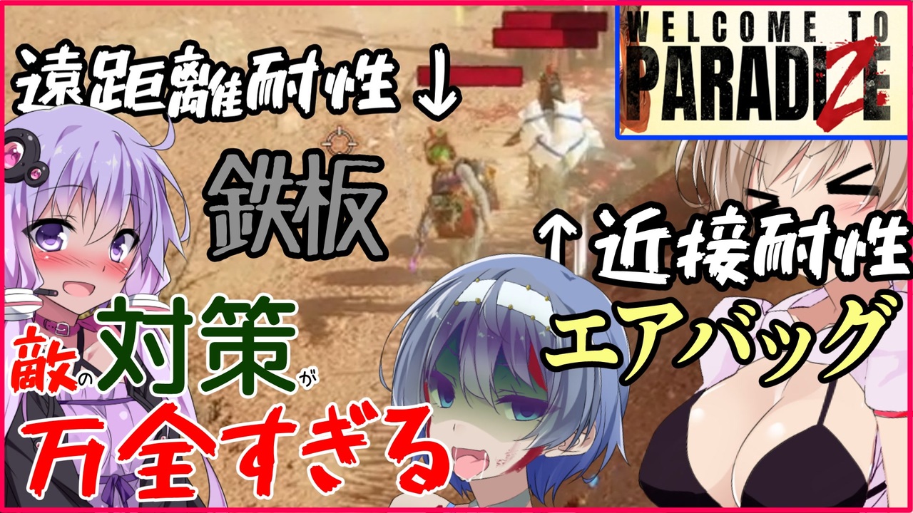 てかゴリ押す以外何も考えてない設計説ありますねこれ・・<br>武器のモーションは作り込んでありますが攻撃力の関係上ほぼほぼ選択肢はない気が・・?<br><br>ゾンビを仲間にできるウェルカムトゥパラダイズです。ノリが軽めのファンキーな作品です。<br><br>スッチム<br><a href="https://store.steampowered.com/app/1519090/Welcome_to_ParadiZe/" target="_blank" rel="noopener nofollow">https://store.steampowered.com/app/1519090/Welcome_to_ParadiZe/</a><br><br>結月ゆかり(淫乱美少女 A.I.Voice)、さとうささら(CevioAI 時々メスガキ)、すずきつづみ(Cevio 酷い目に合う)琴葉茜・葵(A.I.Voice やべー姉妹)、東北きりたん(Voicepeak す!)、ずんだもん(なのだ VoiceVOX) 四国めたん(ノムリッシュ翻訳立ち絵刷新)春日部つむぎ(さいたまの超優しいママJK)ナースロボ_タイプT(ささつづの求道者)WhiteCUL(迫真担当)九州そら(ささやき)※VoiceVOX<br>COEIROINKから松嘩りすくが賑やかしにやってきましたがリリンちゃん(ささやくメスガキ)とクロワちゃん(オホ声の魔女)も便乗して参加しました。<br>あとフリモメン(Voicepeak)はなんやかんやでトレーダーです。<br>以上のまたしても人数が増えすぎた音量注意 ソフトウェアトーク実況 でお送りいたします。<br><br>※グロテスク要素(欠損・首が飛んだり)が映り込んでしまうことがございます。ご注意ください。<br>※音量周りにご注意ください。<br /><span style="font-size: 16px;"><strong>バックパックサバイバーゾンビゲー</strong></span><br><span style="font-size: 18px;"><strong><a href="https://www.nicovideo.jp/watch/sm45887821" class="watch">sm45887821</a></strong></span><br><br>運全振りなThe WasteLand MOD(完結)<br><a href="https://www.nicovideo.jp/series/535958" target="_blank" rel="noopener">series/535958</a><br><br>パート1と単発まとめ<br><a href="https://www.nicovideo.jp/mylist/72399112" target="_blank" rel="noopener">mylist/72399112</a><br><br>その他<br><a href="https://www.nicovideo.jp/series/164391" target="_blank" rel="noopener">series/164391</a><br><br>ツイッター(現X)<br><a href="https://twitter.com/nec_gene" target="_blank" rel="noopener nofollow">https://twitter.com/nec_gene</a><br>ユーチューブ<br><a href="https://www.youtube.com/channel/UCTUIH2IZyXF_NY4NnUHWBWQ" target="_blank" rel="noopener nofollow">https://www.youtube.com/channel/UCTUIH2IZyXF_NY4NnUHWBWQ</a>