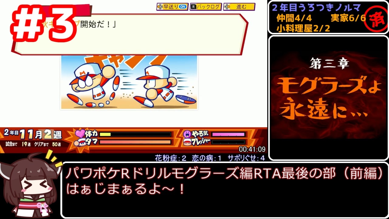 part3(前編)です。<br>動画時間が長くなったので前後編に分割しています。<br><br>久しぶりのパワポケ動画!<br>今回はパワポケRのドリルモグラーズ編のオールAに挑戦しました。<br><br>マイリスト:<a href="https://www.nicovideo.jp/mylist/76502270" target="_blank" rel="noopener">mylist/76502270</a><br>part1:<a href="https://www.nicovideo.jp/watch/sm43506865" class="watch">sm43506865</a><br>part2:<a href="https://www.nicovideo.jp/watch/sm43517930" class="watch">sm43517930</a><br>part3(前編):こ↑こ↓<br>part3(後編):<a href="https://www.nicovideo.jp/watch/sm43535705" class="watch">sm43535705</a><br><br>映像、音声が乱れる箇所があったので参考記録です。<br><br>〇レギュレーションについて<br>①能力オールA達成<br>②仲間全回収(退団させない)<br>③日本一達成<br>④幸恵さんエンド回収<br>⑤ジョー改心エンド回収<br>⑥一部特殊能力必須(パワヒ、アベヒ、広角打法)<br><br>素敵な立ち絵はこちら<br><a href="https://seiga.nicovideo.jp/seiga/im10320406" target="_blank" rel="noopener">im10320406</a><br><br>過去の動画<br>GB版パワポケ1RTA:<a href="https://www.nicovideo.jp/mylist/71526597" target="_blank" rel="noopener">mylist/71526597</a><br>パワポケ3RTA:<a href="https://www.nicovideo.jp/mylist/71954264" target="_blank" rel="noopener">mylist/71954264</a><br>パワポケ4RTA:<a href="https://www.nicovideo.jp/mylist/73996915" target="_blank" rel="noopener">mylist/73996915</a><br>パワポケR極亜久高校編RTA:<a href="https://www.nicovideo.jp/mylist/72637542" target="_blank" rel="noopener">mylist/72637542</a><br>ぬ~ぼ~RTA:<a href="https://www.nicovideo.jp/watch/sm39545414" class="watch">sm39545414</a><br>ロックマンエグゼ6ネット対戦:<a href="https://www.nicovideo.jp/series/408262" target="_blank" rel="noopener">series/408262</a><br>もっと不思議のダンジョン挑戦シリーズ:<a href="https://www.nicovideo.jp/series/368767" target="_blank" rel="noopener">series/368767</a>