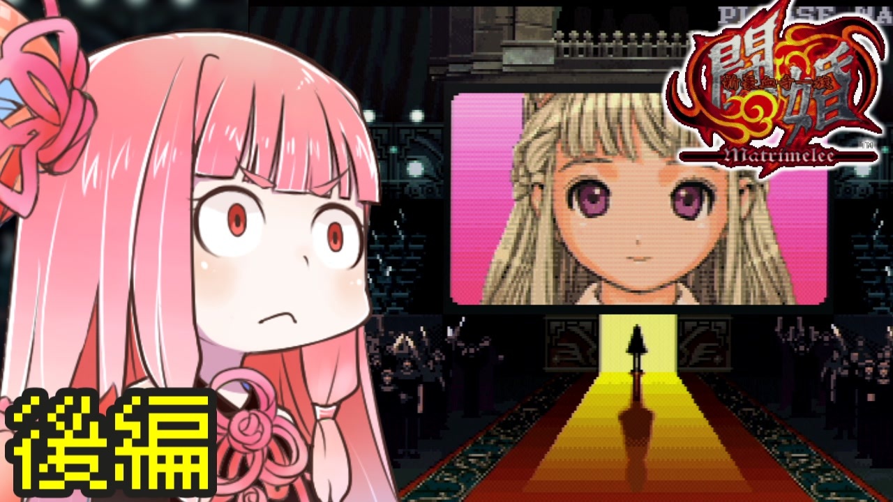 ずん子と茜がハードを問わずに色々なレトロゲームを遊ぶ動画です。<br>強いプリンセスはシシー様よ!<br><br><strong>【今回遊ぶゲーム】</strong><br>ネオジオ「新豪血寺一族 闘婚 ~Matrimelee~」<br>発売年:2003年 メーカー:プレイモア(開発:ノイズファクトリー)<br><br>※この動画は<strong>後編</strong>です。先に前編のご視聴をお願いします。<br>※画質設定<strong>480p</strong>または<strong>720p</strong>でのご視聴を推奨します。<br>(それ以外の設定だとエフェクトが正しく描画されません)<br>※収録機器の関係で画面にノイズや乱れがあります。<br>※茜の関西弁が怪しい箇所があります。<br><br>#1→<a href="https://www.nicovideo.jp/watch/sm35781397" class="watch">sm35781397</a><br><br>#58<strong>前編</strong>→<a href="https://www.nicovideo.jp/watch/sm43488788" class="watch">sm43488788</a> 番外編3→<a href="https://www.nicovideo.jp/watch/sm43572900" class="watch">sm43572900</a><br>#59→<a href="https://www.nicovideo.jp/watch/sm43853292" class="watch">sm43853292</a><br><br><strong>【今回ご紹介した支援絵】</strong>(ニコニコ静画掲載分)<br>珠奈比呂由様→<a href="https://seiga.nicovideo.jp/seiga/im11368082" target="_blank" rel="noopener">im11368082</a> 秋葉様→<a href="https://seiga.nicovideo.jp/seiga/im11390845" target="_blank" rel="noopener">im11390845</a><br />_____________________<br><br><strong>マイリスト(全動画一覧)</strong>→<a href="https://www.nicovideo.jp/mylist/66632451" target="_blank" rel="noopener">mylist/66632451</a><br><strong>ずん子と茜とレトロゲーム</strong>→<a href="https://www.nicovideo.jp/mylist/68686405" target="_blank" rel="noopener">mylist/68686405</a><br><strong>X(旧・</strong><span style="color: #1155cc;"><strong>Twitter</strong></span><strong>)</strong>→<a href="https://twitter.com/Cocoa_sasami" target="_blank" rel="noopener nofollow">https://twitter.com/Cocoa_sasami</a>