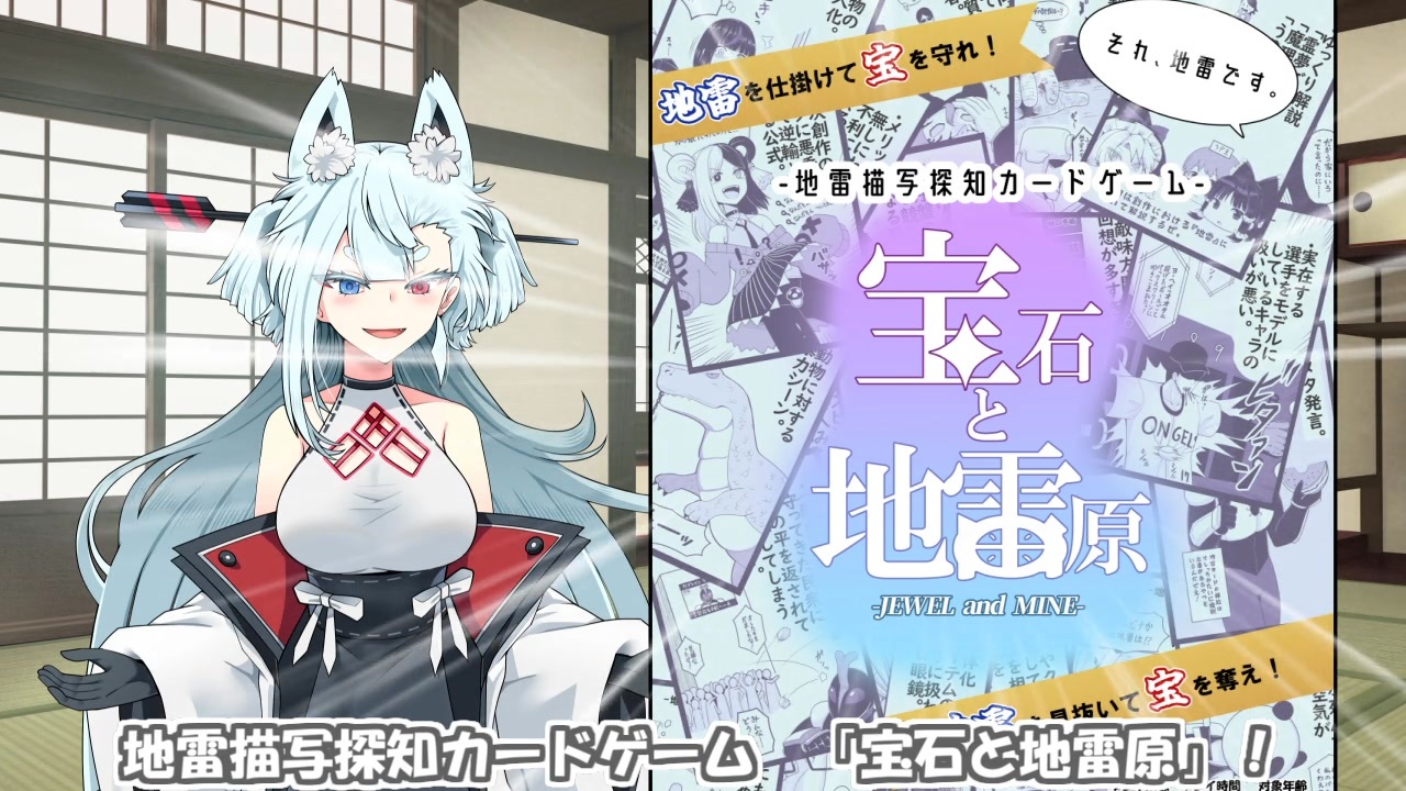 boothの商品ページ→<a href="https://azuki-shark.booth.pm/items/5528519" target="_blank" rel="noopener nofollow">https://azuki-shark.booth.pm/items/5528519</a><br><br>「それ、地雷です」<br>地雷…それは地面に埋設され、踏んだ対象を殺傷する兵器。<br>転じて創作界隈では、作品内で「動物が傷つけられる」「食べ物が粗末にされる」など、知らずに見てしまった苦手な展開や描写を指す言葉として用いられる。<br>地雷描写探知カードゲーム「宝石と地雷原」。本作品は、その地雷描写を、相手を出し抜いて勝つための武器に転じたカードゲームである。<br><br>【内容物】<br>カード×48枚(宝石カード6枚・地雷カード42枚)<br>(地雷カードには全て描き下ろしの挿絵つき)<br>ゲームの遊び方等の説明書はパッケージ裏に記載。<br>購入特典としてオンラインで離れた相手と対戦するためのデータセットをDLできるQRコードがついてます。<br><br>お借りした素材<br>いらすとや 様<br>ニコニコモンズ 様<br>パブリックドメインq 様<br>株式会社エーアイ 様 公式マテリアル 琴葉茜 琴葉葵 (c) AI Inc.<br>効果音ラボ 様
