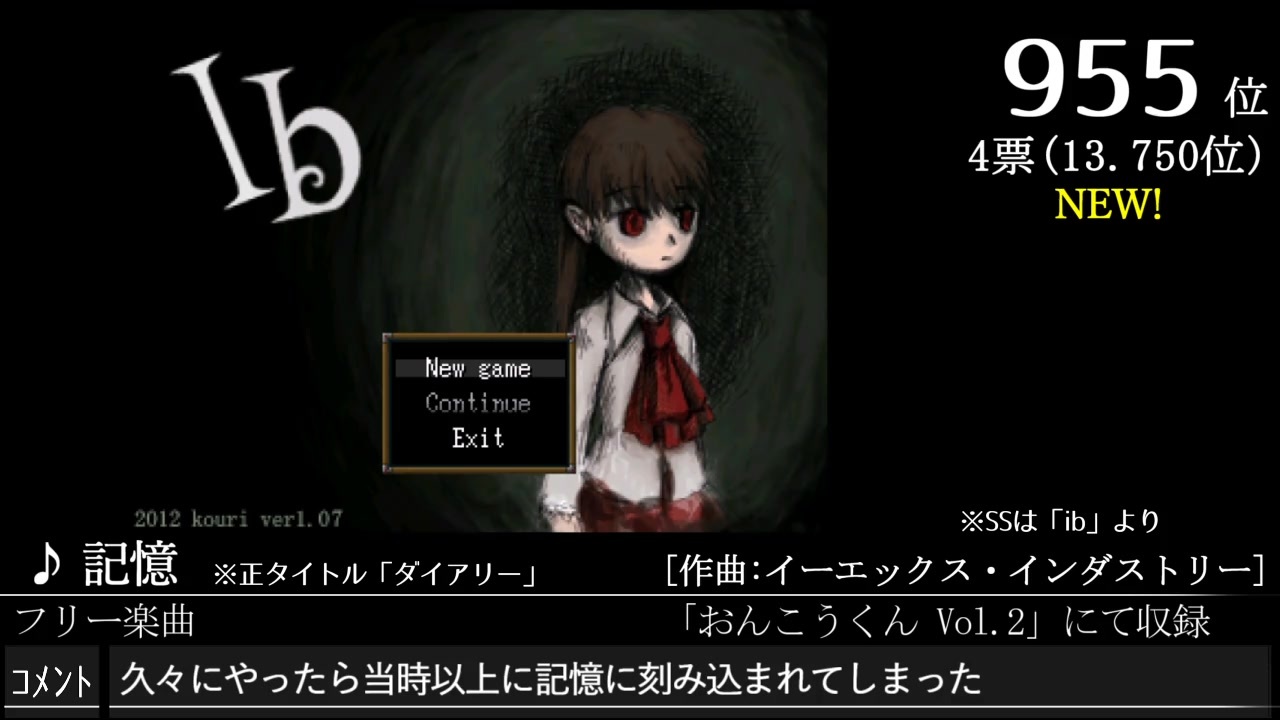<span style="color: #a4c2f4;">違うんだ、別に俺は前回自分でSS芸やった曲に投稿SSで上(?)をいかれたから<br>ムキになって急いでおまけSSの用意に奔走した挙句<br>「もう一曲は長年黒塗りパート(スタッフロール曲)だし<br>テコ入れしてもいいかなー」なんて思い立ってしまった結果<br>編集しながら感涙しちゃって日程がズレたとかそんなヘマを犯した訳では<br>決してないんだ、信じてくれ(遅れてすまないSS大募集中ですの意</span><br><br>それはそれとして、なんと<span style="color: #e06666; font-size: 16px;"><strong>OPイラストを頂きました!</strong></span>感謝感激雨霰……(゚∀゚)<br>---------------------------------<br>スクリーンショット大募集!<br>詳しくは下記投稿フォームのご案内やスクショ状況スプレッドシート等をご確認下さい<br>↓<br><a href="https://ws.formzu.net/dist/S9500351/" target="_blank" rel="noopener nofollow">https://ws.formzu.net/dist/S9500351/</a><br><br>投票結果はこちら<br>↓<br><a href="https://w.atwiki.jp/gamemusicbest100/pages/10214.html" target="_blank" rel="noopener nofollow">https://w.atwiki.jp/gamemusicbest100/pages/10214.html</a><br><br>ご質問等ある際はこちらのページへコメント下さいませ<br>↓<br><a href="https://arutoneriko2.hatenablog.com/entry/2023/12/17/001849" target="_blank" rel="noopener nofollow">https://arutoneriko2.hatenablog.com/entry/2023/12/17/001849</a><br>---------------------------------<br><a href="https://www.nicovideo.jp/watch/sm43505007" class="watch">sm43505007</a>←Part1|今回|Part3→<a href="https://www.nicovideo.jp/watch/sm43567904" class="watch">sm43567904</a> <a href="https://www.nicovideo.jp/mylist/50993049" target="_blank" rel="noopener">mylist/50993049</a><br>---------------------------------<br>↓ショートカット↓<br><br>977位<a href="#" class="seekTime" data-seekTime="0:34" onclick="seekNicoPlayer('#0:34'); return false;">#0:34</a> 976位<a href="#" class="seekTime" data-seekTime="2:16" onclick="seekNicoPlayer('#2:16'); return false;">#2:16</a> 975位<a href="#" class="seekTime" data-seekTime="4:14" onclick="seekNicoPlayer('#4:14'); return false;">#4:14</a> 974位<a href="#" class="seekTime" data-seekTime="7:40" onclick="seekNicoPlayer('#7:40'); return false;">#7:40</a> 973位<a href="#" class="seekTime" data-seekTime="10:08" onclick="seekNicoPlayer('#10:08'); return false;">#10:08</a> 972位<a href="#" class="seekTime" data-seekTime="12:14" onclick="seekNicoPlayer('#12:14'); return false;">#12:14</a><br>971位<a href="#" class="seekTime" data-seekTime="14:14" onclick="seekNicoPlayer('#14:14'); return false;">#14:14</a> 969位<a href="#" class="seekTime" data-seekTime="15:55" onclick="seekNicoPlayer('#15:55'); return false;">#15:55</a> 969位<a href="#" class="seekTime" data-seekTime="17:34" onclick="seekNicoPlayer('#17:34'); return false;">#17:34</a> 967位<a href="#" class="seekTime" data-seekTime="20:14" onclick="seekNicoPlayer('#20:14'); return false;">#20:14</a> 967位<a href="#" class="seekTime" data-seekTime="22:47" onclick="seekNicoPlayer('#22:47'); return false;">#22:47</a> 964位<a href="#" class="seekTime" data-seekTime="24:36" onclick="seekNicoPlayer('#24:36'); return false;">#24:36</a><br>964位<a href="#" class="seekTime" data-seekTime="26:19" onclick="seekNicoPlayer('#26:19'); return false;">#26:19</a> 964位<a href="#" class="seekTime" data-seekTime="30:31" onclick="seekNicoPlayer('#30:31'); return false;">#30:31</a> 963位<a href="#" class="seekTime" data-seekTime="34:27" onclick="seekNicoPlayer('#34:27'); return false;">#34:27</a> 962位<a href="#" class="seekTime" data-seekTime="37:37" onclick="seekNicoPlayer('#37:37'); return false;">#37:37</a> 961位<a href="#" class="seekTime" data-seekTime="40:11" onclick="seekNicoPlayer('#40:11'); return false;">#40:11</a> 960位<a href="#" class="seekTime" data-seekTime="42:29" onclick="seekNicoPlayer('#42:29'); return false;">#42:29</a><br>955位<a href="#" class="seekTime" data-seekTime="45:32" onclick="seekNicoPlayer('#45:32'); return false;">#45:32</a> 955位<a href="#" class="seekTime" data-seekTime="48:31" onclick="seekNicoPlayer('#48:31'); return false;">#48:31</a> 955位<a href="#" class="seekTime" data-seekTime="51:01" onclick="seekNicoPlayer('#51:01'); return false;">#51:01</a> 955位<a href="#" class="seekTime" data-seekTime="56:11" onclick="seekNicoPlayer('#56:11'); return false;">#56:11</a> 955位<a href="#" class="seekTime" data-seekTime="62:05" onclick="seekNicoPlayer('#62:05'); return false;">#62:05</a> 952位<a href="#" class="seekTime" data-seekTime="64:08" onclick="seekNicoPlayer('#64:08'); return false;">#64:08</a><br>952位<a href="#" class="seekTime" data-seekTime="68:08" onclick="seekNicoPlayer('#68:08'); return false;">#68:08</a> 952位<a href="#" class="seekTime" data-seekTime="72:19" onclick="seekNicoPlayer('#72:19'); return false;">#72:19</a>