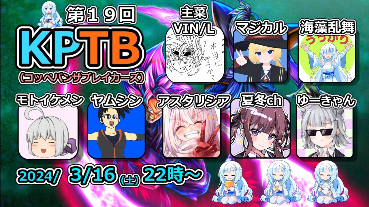 【あらすじ】<br>S5後初めてのKPTBとなった第19回。<br>皆新レイダーの操作にも慣れてくる頃合いだが、一方で強力なスキルも実装された。<br>この環境ならサバ全勝もあるのではないかと予想する夏色花梨先輩だが……?<br>次回「最強王子伝説」<br>絶対見てくれよな!<br><br>【登場人物】<br>夏色花梨先輩:撮れ高確保に情熱を燃やす実況少女。<br>花隈千冬後輩:冷静沈着(?)なアシスタント。先輩が好き。<br><br>【参加者様(敬称略・頻出呼称)】<br>主催:VIN/L(ささらちゃん) <a href="https://www.nicovideo.jp/user/123010347" target="_blank" rel="noopener">user/123010347</a><br>moto ikemen <a href="https://www.nicovideo.jp/user/4953605" target="_blank" rel="noopener">user/4953605</a><br>ヤムシン <a href="https://www.nicovideo.jp/user/21819424" target="_blank" rel="noopener">user/21819424</a> 全試合アーカイブ→<a href="https://live.nicovideo.jp/watch/lv344629170" target="_blank" rel="noopener">lv344629170</a><br>マジカル(メスガキ) <a href="https://www.nicovideo.jp/user/16043532" target="_blank" rel="noopener">user/16043532</a>(YouTubeの方に全試合アーカイブ有り)<br>眠い薬品@あすたりしあ(つむぎちゃん) <a href="https://www.nicovideo.jp/user/1937506" target="_blank" rel="noopener">user/1937506</a><br>ゆーきゃん(六花) <a href="https://www.nicovideo.jp/user/45635109" target="_blank" rel="noopener">user/45635109</a><br>海藻乱舞 <a href="https://www.nicovideo.jp/user/128788617" target="_blank" rel="noopener">user/128788617</a><br><br>【立ち絵】<br>からい先生 <a href="https://twitter.com/flat_fish_" target="_blank" rel="noopener nofollow">https://twitter.com/flat_fish_</a><br><br>【扉絵】<br>たれこ先生 <a href="https://twitter.com/tareko_ill" target="_blank" rel="noopener nofollow">https://twitter.com/tareko_ill</a><br><br>【倍速時センター先輩】<br>カロ先生 <a href="https://seiga.nicovideo.jp/user/illust/120784349" target="_blank" rel="noopener">user/illust/120784349</a><br><br>【いいね忘れ防止】<br>こーすけさんたまりあ先生 <a href="https://twitter.com/kousuke_LP" target="_blank" rel="noopener nofollow">https://twitter.com/kousuke_LP</a><br><br>【使用ソフト】<br>CevioAI 夏色花梨<br>CevioAI 花隈千冬<br>synthesizerV 夏色花梨<br>synthesizerV 花隈千冬<br>synthesizerV 小春六花<br>synthesizerV POPY