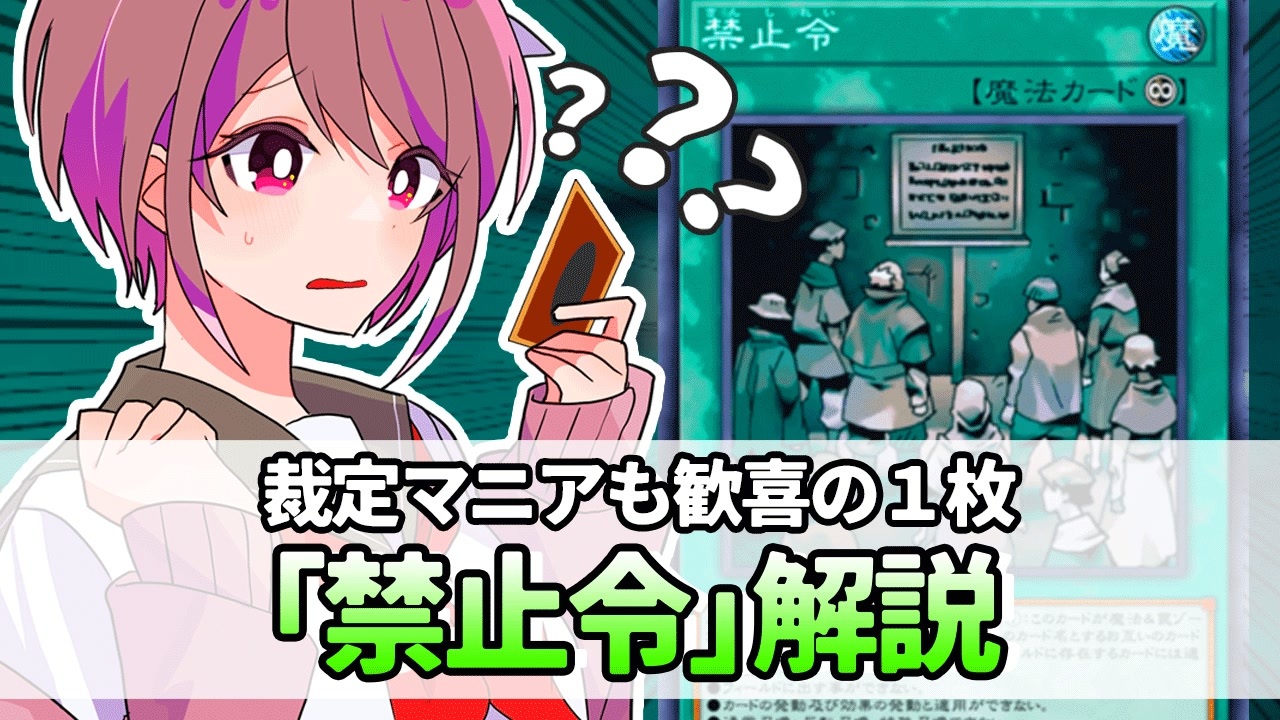 ピンポイントメタカードの極致である、禁止令の解説です。<br>中々珍しい効果を持っていて、これに関わる、「適用」や「宣言」など付帯するルールにも解説にも触れています。<br><br><a href="#" class="seekTime" data-seekTime="3:42" onclick="seekNicoPlayer('#3:42'); return false;">#3:42</a><br>裁定が変わっており、すでに適用した効果については、全て処理を行うようになりました。<br><a href="https://www.db.yugioh-card.com/yugiohdb/faq_search.action?ope=5&fid=24059&keyword=&tag=-1" target="_blank" rel="noopener nofollow">https://www.db.yugioh-card.com/yugiohdb/faq_search.action?ope=5&fid=24059&keyword=&tag=-1</a><br /><br>【素材・制作者様】<br><a href="https://kahaduxxxe.booth.pm/" target="_blank" rel="noopener nofollow">https://kahaduxxxe.booth.pm/</a><br><a href="https://twitter.com/akr_1020" target="_blank" rel="noopener nofollow">https://twitter.com/akr_1020</a><br>※許可を得て使用しております。<br><br>【Twitter】<br><a href="https://twitter.com/pi_ni_ki" target="_blank" rel="noopener nofollow">https://twitter.com/pi_ni_ki</a><br><br>【支援絵アルバム】<br><a href="https://note.com/pix989/n/nf5aab604fd77" target="_blank" rel="noopener nofollow">https://note.com/pix989/n/nf5aab604fd77</a>