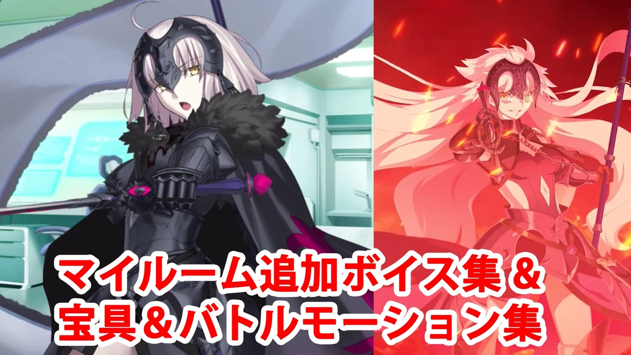 「奏章Ⅱ 不可逆廃棄孔 イド」開始時の<br>モーションリニューアルに合わせて追加されたジャンヌ・オルタ(CV:坂本真綾)のマイルーム会話とバトルボイスのまとめと<br>リニューアルされた全バトルモーション(攻撃、スキル、EXアタック、宝具)のまとめです。<br>宝具ボイスは4種、スキルモーションは3種類です。<br><br>宝具「吼え立てよ、我が憤怒(ラ・グロンドメント・デュ・ヘイン)」<br><br>奏章Ⅱクリア後追加ボイス→<a href="https://www.nicovideo.jp/watch/sm43560099" class="watch">sm43560099</a><br><br>【チャプター】<br><a href="#" class="seekTime" data-seekTime="0:00" onclick="seekNicoPlayer('#0:00'); return false;">#0:00</a> 追加マイルームボイス<br><a href="#" class="seekTime" data-seekTime="1:45" onclick="seekNicoPlayer('#1:45'); return false;">#1:45</a> 追加バトルボイス<br><a href="#" class="seekTime" data-seekTime="4:41" onclick="seekNicoPlayer('#4:41'); return false;">#4:41</a> 追加バトルボイス(霊衣「邪竜の魔女ver新宿1999」)<br><a href="#" class="seekTime" data-seekTime="5:21" onclick="seekNicoPlayer('#5:21'); return false;">#5:21</a> リニューアル版モーション(第1段階)<br><a href="#" class="seekTime" data-seekTime="7:48" onclick="seekNicoPlayer('#7:48'); return false;">#7:48</a> リニューアル版モーション(第2段階)<br><a href="#" class="seekTime" data-seekTime="10:03" onclick="seekNicoPlayer('#10:03'); return false;">#10:03</a> リニューアル版モーション(第3段階)<br><a href="#" class="seekTime" data-seekTime="12:25" onclick="seekNicoPlayer('#12:25'); return false;">#12:25</a> リニューアル版モーション(霊衣)<br><br>YouTube版はこちら<br><a href="https://www.youtube.com/watch?v=B-DxpTbTVro" target="_blank" rel="noopener nofollow">https://www.youtube.com/watch?v=B-DxpTbTVro</a><br><br>投稿済ボイス集→<a href="https://www.nicovideo.jp/mylist/57873980" target="_blank" rel="noopener">mylist/57873980</a>、<a href="https://www.nicovideo.jp/mylist/68037946" target="_blank" rel="noopener">mylist/68037946</a><br>