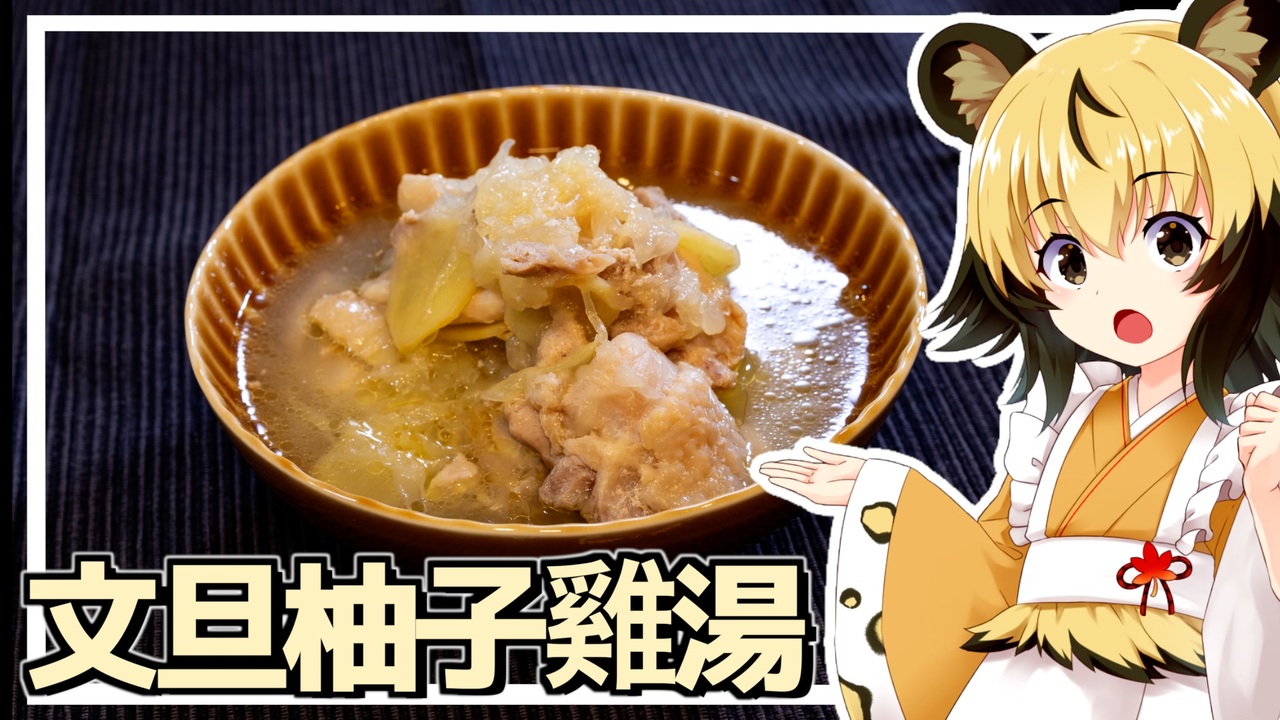 うまいさん(<a href="https://www.nicovideo.jp/user/38242225" target="_blank" rel="noopener">user/38242225</a> )より、土佐文旦をいただきました!!!<br>ありがとうございます。<br><br>ということで、文旦を使ったとってもシンプルで簡単な台湾料理「文旦柚子雞湯」を作っていきましょう。<br><br>文旦は大きな柑橘で<br>そのまま食べたり、サラダに加えたり、お菓子にも合いますね。<br>ほかの柑橘よりも酸味と甘味のバランスがよく<br>強く主張しすぎない優しさがあるのです。<br><br>なら加熱料理にもあり、ですよね^^<br><br>■材料<br>・鶏もも肉 1枚<br>・文旦 1/2個<br>・生姜 1かけら<br>・塩 小さじ1<br><br>■所要時間<br>作業時間:70分程度(1時間の煮込み時間を含む)<br><br>youtube:<a href="https://youtu.be/1kJR44_d-0k" target="_blank" rel="noopener nofollow">https://youtu.be/1kJR44_d-0k</a><br>twitter:@lycaon_kitchen<br><br>りおんの和風喫茶:<a href="https://www.nicovideo.jp/series/77190" target="_blank" rel="noopener">series/77190</a><br>おつかれごはん:<a href="https://www.nicovideo.jp/series/155690" target="_blank" rel="noopener">series/155690</a><br>手作り和菓子でちょっとひとやすみしませんか?:<a href="https://www.nicovideo.jp/series/155691" target="_blank" rel="noopener">series/155691</a><br><br>立ち絵:星華 彩二魔 様<br>イラスト:AWD kitchen<br>音源:DOVA-SYNDROME<br>音声:AI.VOICE 紲星あかり+ exVOICE