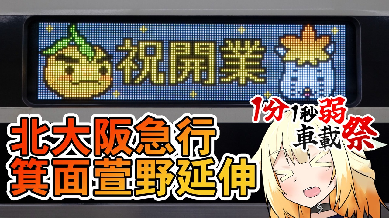 本動画はとれんた君様(<a href="https://www.nicovideo.jp/user/65532626" target="_blank" rel="noopener">user/65532626</a>)主催の1分1秒弱車載祭参加動画になります。<br>撮影してから投稿まで5時間でした。もうやらない。<br><br>あらためて北大阪急行の箕面萱野延伸開業おめでとうございます!<br><br><br>youtube版 → <a href="https://youtu.be/c95KYA_kUVw" target="_blank" rel="noopener nofollow">https://youtu.be/c95KYA_kUVw</a><br>X(旧twitter) → @1_83m<br><br><br>動画用カメラ:DJI Osmo Action 4<br>静止画用:Panasonic DC-S5<br>動画編集ソフト:AviUtl / Adobe Lightroom / Adobe Photoshop<br><br>////////////////////////////////////////////////////////////////////////////////////////////////////<br>【ツーリング動画シリーズ】<br>年越し宗谷岬リベンジ編 → <a href="https://www.nicovideo.jp/series/416233" target="_blank" rel="noopener">series/416233</a><br>2022GW九州編 → <a href="https://www.nicovideo.jp/series/371704" target="_blank" rel="noopener">series/371704</a><br>離島ツーリング編 → <a href="https://www.nicovideo.jp/series/126282" target="_blank" rel="noopener">series/126282</a><br>2020北海道ツーリング編 → <a href="https://www.nicovideo.jp/series/224272" target="_blank" rel="noopener">series/224272</a><br>厳冬ツーリング(冬宗谷)編 → <a href="https://www.nicovideo.jp/series/126281" target="_blank" rel="noopener">series/126281</a><br>2019GW北日本編 → <a href="https://www.nicovideo.jp/series/126280" target="_blank" rel="noopener">series/126280</a><br>2018北海道編 → <a href="https://www.nicovideo.jp/series/126277" target="_blank" rel="noopener">series/126277</a><br>2018GW東北編 → <a href="https://www.nicovideo.jp/series/126276" target="_blank" rel="noopener">series/126276</a><br>単発動画・プチ動画たち → <a href="https://www.nicovideo.jp/series/126278" target="_blank" rel="noopener">series/126278</a><br><br>【その他のシリーズ】<br>登山動画シリーズ → <a href="https://www.nicovideo.jp/series/285046" target="_blank" rel="noopener">series/285046</a><br>料理動画シリーズ → <a href="https://www.nicovideo.jp/series/285870" target="_blank" rel="noopener">series/285870</a><br><br><br>
