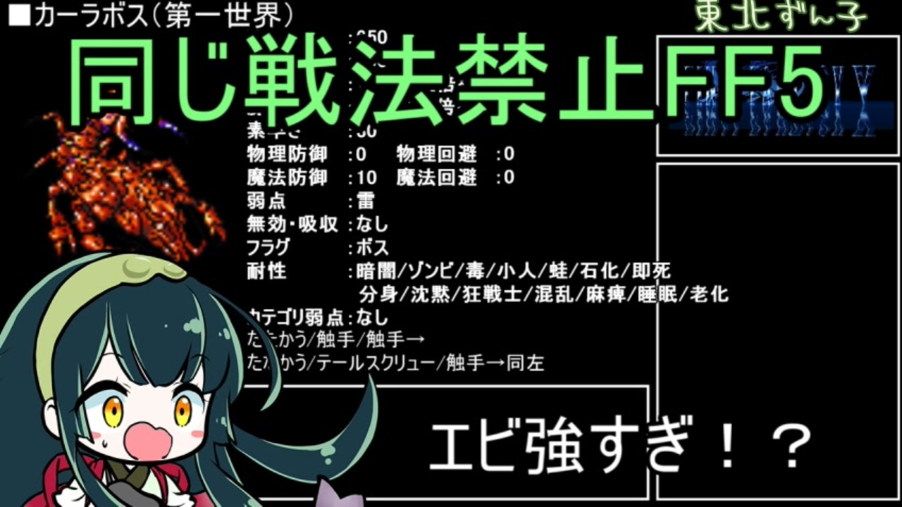SFCソフト「FINALFANTASY5」に登場するボスを戦法の被りなしで撃破するやり込み動画シリーズの解説です。<br>縛り内容は解説動画見て下さい。<br><a href="https://www.nicovideo.jp/watch/sm43541277" target="_blank" rel="noopener nofollow">https://www.nicovideo.jp/watch/sm43541277</a><br><br>■今回の範囲<br>風の神殿~北の山まで<br><br>Q:アンデットでは?<br>A:GBAでは「アンデッドへと すがたをかえる!」に修正されている<br><br>Q:装備重いと軽いってこと?<br>A:±逆ですね。重いほど待ち時間が増える( ;∀;)<br><br>■低レベル攻略<br>Lv2114型。ジョブアビリティ縛りはしません。<br><br>■攻略時の制約<br>・投げるは基本的に禁止(とあるボス戦でのみ使用。投げられる武器を持ってるボスが悪い)<br>・調合は部分的に禁止(使う時は説明します)<br>・エクスデスへのファイナルアタック封じ禁止<br>・エンディングが正常に終わらないケースを禁止<br>・その時にしか使用できない戦法を最優先<br>・はなつ/魔法のランプなど無消費大ダメージ手段禁止<br>・武器装備入れ替えによる分身維持禁止<br><br>とりあえず実機で出来ることは何でも利用してボスをやっつけちゃいます。<br><br>プレイ環境:スーパーファミコン(SHVC-001)<br>コントローラ:通常、連射パッドなし<br>録画環境 :ELEVIEW コンポジット/S端子 to HDMI 変換器+GC551PLUS