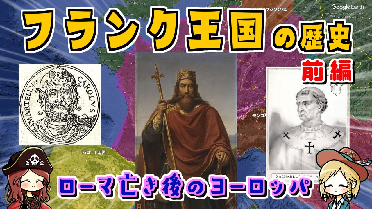 ローマ帝国が崩壊して、その後なんやかんやあってフランス、ドイツ、イタリアといった中世ヨーロッパ世界ができた…<br><br>そのなんやかんやの代表、フランク王国のお話です。<br>意外と知る機会ないよね?ってところで歴史認識のスキマを埋めるパテみたいな動画です。<br><br>☆限定動画アリのニコニコチャンネル『モンド・ヒストリカの離宮』もよろしくね→ <a href="https://ch.nicovideo.jp/mond-historica" target="_blank" rel="noopener nofollow">https://ch.nicovideo.jp/mond-historica</a><br><br>今回の主要参考文献:<br>レジーヌ・ル・ジャン(2009)『メロヴィング朝』加納修訳 白水社 → <a href="https://amzn.to/43nJIq9" target="_blank" rel="noopener nofollow">https://amzn.to/43nJIq9</a><br>五十嵐修(2001)『地上の夢 キリスト教帝国』講談社 → <a href="https://amzn.to/3VuMGXM" target="_blank" rel="noopener nofollow">https://amzn.to/3VuMGXM</a><br>佐藤彰一(2013)『カール大帝 ヨーロッパの父』山川出版 → <a href="https://amzn.to/3x2nFcv" target="_blank" rel="noopener nofollow">https://amzn.to/3x2nFcv</a><br>マガリ・クメール/ブリューノ・デュメジル(2019)『ヨーロッパとゲルマン部族国家』大月康弘/小澤雄太郎訳 白水社 → <a href="https://amzn.to/43q9J8e" target="_blank" rel="noopener nofollow">https://amzn.to/43q9J8e</a><br>池谷文夫 (2019)『神聖ローマ帝国 ドイツ王が支配した帝国』刀水書房 → <a href="https://amzn.to/3TsT3bn" target="_blank" rel="noopener nofollow">https://amzn.to/3TsT3bn</a><br>三佐川亮宏(2023)『オットー大帝』中央公論新社 → <a href="https://amzn.to/3vsrU0f" target="_blank" rel="noopener nofollow">https://amzn.to/3vsrU0f</a><br>菊池良生(2003)『神聖ローマ帝国』講談社 → <a href="https://amzn.to/3PuL38T" target="_blank" rel="noopener nofollow">https://amzn.to/3PuL38T</a><br><br>その他 Wikipediaなど<br />━━━━━━━━━━━━━━━━━━━━━<br><br>この動画はクリエイティブ・コモンズ継承(CC-BY-SA)ライセンスの素材を使用して制作しています。(<a href="https://creativecommons.org/licenses/by-sa/4.0/)" target="_blank" rel="noopener nofollow">https://creativecommons.org/licenses/by-sa/4.0/)</a><br>規約に基づき、この動画もCC-BY-SA 4.0 のもとで公開します。<br><br>投稿者共通情報☆彡<br><br>BGM, SE:ニコニ・コモンズ様<br><a href="http://commons.nicovideo.jp/" target="_blank" rel="noopener nofollow">http://commons.nicovideo.jp/</a><br>魔王魂様<br><a href="https://maoudamashii.jokersounds.com/" target="_blank" rel="noopener nofollow">https://maoudamashii.jokersounds.com/</a><br>Audiostock様<br><a href="https://audiostock.jp/" target="_blank" rel="noopener nofollow">https://audiostock.jp/</a><br><br>立ち絵 霊夢・魔理沙(黒子式):nicotalk様<br><a href="http://www.nicotalk.com/charasozai.html" target="_blank" rel="noopener nofollow">http://www.nicotalk.com/charasozai.html</a><br><br>立ち絵 パトラ、マリー、アン、メアリ:ライフライフ様<br><a href="https://0801lifelife.tumblr.com/" target="_blank" rel="noopener nofollow">https://0801lifelife.tumblr.com/</a><br><br>使用ツール1:ゆっくりムービーメーカー4<br><a href="https://manjubox.net/ymm4/" target="_blank" rel="noopener nofollow">https://manjubox.net/ymm4/</a><br><br>使用ツール2:AviUtl<br><a href="http://spring-fragrance.mints.ne.jp/aviutl/" target="_blank" rel="noopener nofollow">http://spring-fragrance.mints.ne.jp/aviutl/</a><br><br>各時代の地図 : World History Maps & Timelines <br><a href="http://geacron.com/home-en/" target="_blank" rel="noopener nofollow">http://geacron.com/home-en/</a><br><br>ゆっくりボイスについて:AquesTalkライセンス取得済み<br><br>キャラクターボイス<br>アン・ボニー:羽ノ華(A.I.VOICE)<br>メアリ・リード:琴葉 葵(A.I.VOICE)<br>クレオパトラ:結月ゆかり(VOICEROID2)<br>マリー‐アントワネット:東北きりたん (VOICEROID EX)<br>その他キャラ:青山龍星(A.I.VOICE)、伊織弓鶴(A.I.VOICE2)、栗田まろん(A.I.VOICE)、宮舞モカ(VOICEPEAK)、フリモメン(VOICEPEAK)<br><br><br><br>その他フリー素材ご提供元の皆様に圧倒的感謝<br>