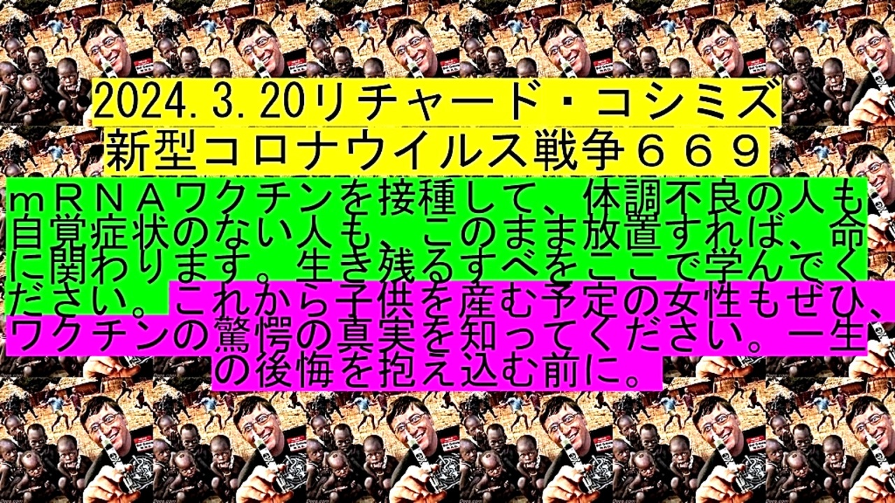 <span style="color: #cc4125;"><strong>「 テーマ : 新型コロナウイルス戦争 669 」</strong></span><br><br><span style="color: #ff0000;"><strong>「『 mRNAワクチン 』を接種して、『 体調不良の人 』も『 自覚症状のない人 』も、このまま『 放置 』<br> すれば、『 命 』に関わります。『 生き残るすべ 』をここで学んでください。これから『 子供を産む<br> 予定の女性 』もぜひ、『 ワクチンの驚愕の真実 』を知ってください。『 一生の後悔を抱え込む前に 』」</strong></span><br><br> <span style="color: #0000ff;"><strong>◐『 イベルメクチン・アビガン服用後 』の体験談等をお寄せ下さい。RK</strong></span><br> <span style="color: #0000ff;"><strong>E-mail : richardkoshimizu@gmail.com</strong></span><br><br> <span style="color: #38761d;"><strong>◐ リチャード・コシミズ・チャンネル『⦅ ニコニコ チャンネル ⦆』</strong></span><br> <span style="color: #38761d;"><strong><a href="https://ch.nicovideo.jp/richardkoshimizu" target="_blank" rel="noopener nofollow">https://ch.nicovideo.jp/richardkoshimizu</a><br><br> ◐ リチャード・コシミズ『 ニコニコ生放送⦅ LIVE ⦆』</strong></span><br> <span style="color: #38761d;"><strong><a href="https://www.nicovideo.jp/user/120930363/live_programs" target="_blank" rel="noopener nofollow">https://www.nicovideo.jp/user/120930363/live_programs</a><br><br> ◐ リチャード・コシミズ『 Rumble 』公式 動画ギャラリー</strong></span><br> <span style="color: #38761d;"><strong><a href="https://rumble.com/user/richardkoshimizu" target="_blank" rel="noopener nofollow">https://rumble.com/user/richardkoshimizu</a></strong></span><br><br> <span style="color: #38761d;"><strong>◐ リチャード・コシミズ『 ニコニコ動画⦅ 全動画 ⦆』公式 動画ギャラリー</strong></span><br> <span style="color: #38761d;"><strong><a href="https://www.nicovideo.jp/user/121957117/video" target="_blank" rel="noopener nofollow">https://www.nicovideo.jp/user/121957117/video</a></strong></span>