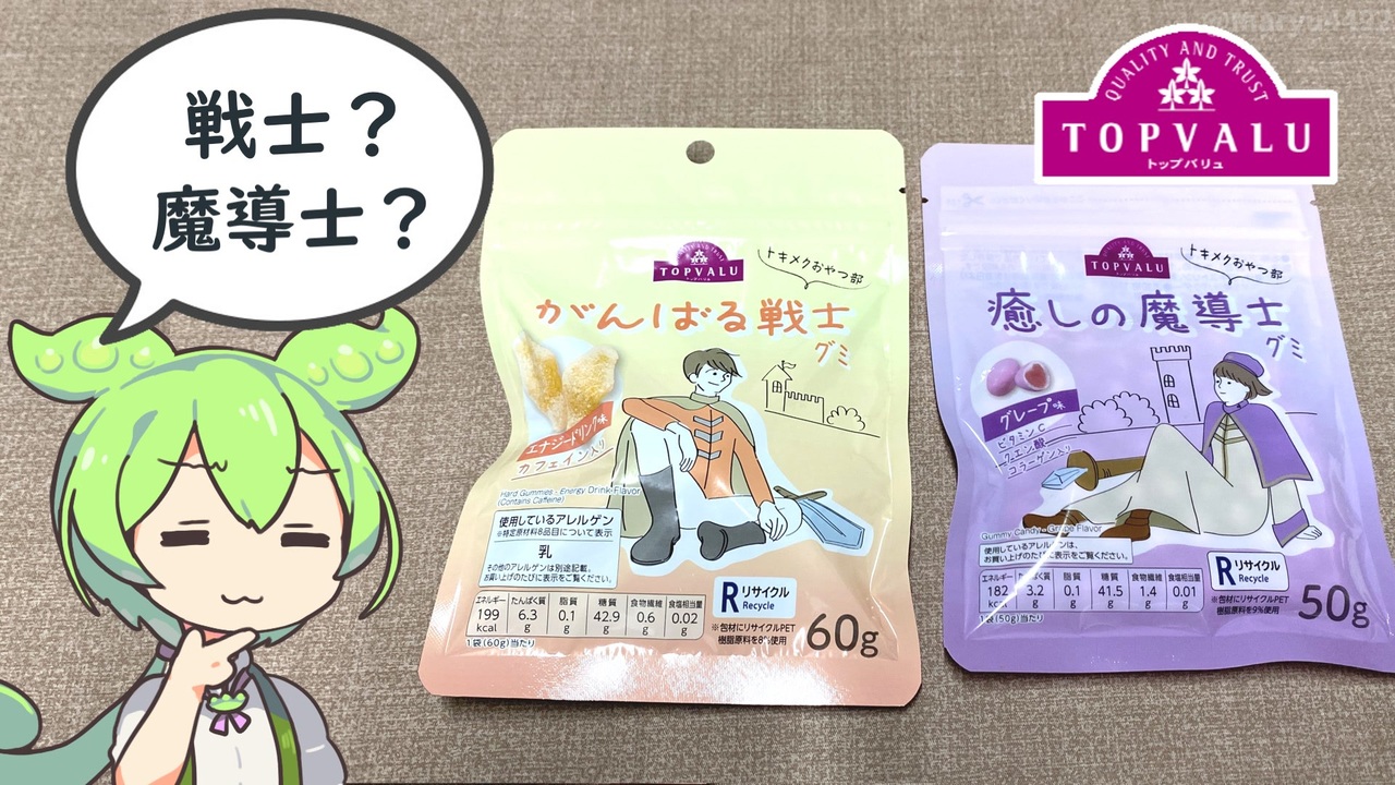 トップバリュでは「トキメクおやつ部」という<br>自分へのご褒美やみんなとシェアしたお菓子のシリーズを展開しるようです。<br>今回はちょっと気になる商品名のブツを買ってきました。<br><br><br>【参考】<br>トキメクおやつ部(トップバリュ)<br><a href="https://www.topvalu.net/tokimekuoyatsubu/" target="_blank" rel="noopener nofollow">https://www.topvalu.net/tokimekuoyatsubu/</a><br>トキメクおやつ部 がんばる戦士グミ エナジードリンク味(トップバリュ)<br><a href="https://www.topvalu.net/items/detail/4549414620191/" target="_blank" rel="noopener nofollow">https://www.topvalu.net/items/detail/4549414620191/</a><br>トキメクおやつ部 癒しの魔導士グミ グレープ味(トップバリュ)<br><a href="https://www.topvalu.net/items/detail/4549414620184/" target="_blank" rel="noopener nofollow">https://www.topvalu.net/items/detail/4549414620184/</a><br>UHA味覚糖<br><a href="https://www.uha-mikakuto.co.jp/index.html" target="_blank" rel="noopener nofollow">https://www.uha-mikakuto.co.jp/index.html</a><br>かむかむレモン(三菱食品)<br><a href="https://www.mitsubishi-shokuhin.com/confectionery/camucamu/20220803087004.html" target="_blank" rel="noopener nofollow">https://www.mitsubishi-shokuhin.com/confectionery/camucamu/20220803087004.html</a><br>ライフガード(チェリオ)<br><a href="https://www.cheerio.co.jp/lifeguard/" target="_blank" rel="noopener nofollow">https://www.cheerio.co.jp/lifeguard/</a><br>コーラアップ(株司会社明治)<br><a href="https://www.meiji.co.jp/products/brand/cola-up/" target="_blank" rel="noopener nofollow">https://www.meiji.co.jp/products/brand/cola-up/</a><br>強い弾力の食感 グミ菓子好調 カバヤ食品、来年で発売10年(山陽新聞デジタル 2023年12月28日)<br><br>【使用した素材】(※敬称略)<br>(合成音声)VOICEVOX/ずんだもん/四国めたん<br><a href="https://voicevox.hiroshiba.jp/" target="_blank" rel="noopener nofollow">https://voicevox.hiroshiba.jp/</a><br>(立ち絵)坂本アヒル<br><a href="https://seiga.nicovideo.jp/seiga/im10788496" target="_blank" rel="noopener">im10788496</a>/<a href="https://seiga.nicovideo.jp/seiga/im10791276" target="_blank" rel="noopener">im10791276</a><br>(楽曲)甘茶の音楽工房/「楽しい麦畑」「お城の舞踏会」<br><a href="https://amachamusic.chagasi.com/" target="_blank" rel="noopener nofollow">https://amachamusic.chagasi.com/</a>