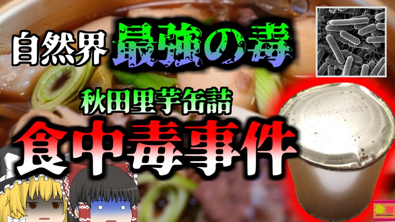 <a href="#" class="seekTime" data-seekTime="00:00" onclick="seekNicoPlayer('#00:00'); return false;">#00:00</a> OP<br><a href="#" class="seekTime" data-seekTime="00:09" onclick="seekNicoPlayer('#00:09'); return false;">#00:09</a> 本編開始<br><a href="#" class="seekTime" data-seekTime="00:54" onclick="seekNicoPlayer('#00:54'); return false;">#00:54</a> 「ボツリヌス菌」<br><a href="#" class="seekTime" data-seekTime="2:28" onclick="seekNicoPlayer('#2:28'); return false;">#2:28</a> 発症までの経緯<br><a href="#" class="seekTime" data-seekTime="3:29" onclick="seekNicoPlayer('#3:29'); return false;">#3:29</a> 保健所の調査<br><a href="#" class="seekTime" data-seekTime="4:50" onclick="seekNicoPlayer('#4:50'); return false;">#4:50</a> 芋の缶詰<br><a href="#" class="seekTime" data-seekTime="6:18" onclick="seekNicoPlayer('#6:18'); return false;">#6:18</a> 熱に強い細菌<br><a href="#" class="seekTime" data-seekTime="7:13" onclick="seekNicoPlayer('#7:13'); return false;">#7:13</a> 時代的な背景<br><a href="#" class="seekTime" data-seekTime="8:08" onclick="seekNicoPlayer('#8:08'); return false;">#8:08</a> 予防方法と注意点<br><br>今回紹介するのは、以前リクエストがありました、国内のボツリヌス菌食中毒事例です。<br>わが国の本州北部の山地にある「秋田県」某所の病院にはこの日、4名の男女が緊急搬送されてきました。<br>彼らは一様に腹痛、吐き気の症状を訴え、父親の「Aさん」などは自発呼吸ができなくなる、呼吸困難の様相を呈し、救急車によって搬送されてきました。<br>医師は直ちに処置を行い、彼らの入院措置をとりました。<br>そして検査の結果、彼らは「ボツリヌス症」だと診断されました。<br>このボツリヌス症は、ボツリヌス菌という細菌が作り出す、ボツリヌス毒素を摂取することで発症し、数時間から数日程度の潜伏期間を経て、腹痛、吐き気、嘔吐、視覚障害といった、神経症状を引き起こすのが特徴で、菌自体は土壌、河川など、言ってみればどこにでもいる細菌でした。<br><br>しかし、この細菌は「嫌気性」という、空気を嫌う性質があり、低酸素状況にならなければこの毒素を産生しません。<br>そこで医師は保健所に通報し、保健所は彼らの自宅に残された夕食の残品など、32品目を研究所に送り調査した結果、里芋の煮物からボツリヌス菌とその毒素を検出。<br>患者の家族から事情を聴くと、これは知人から譲り受けた、里芋の缶詰を使って作られたもの、ということでした。<br>保健所はこの缶詰の製造者を調査したところ、十分な〇菌が行われておらず・・・<br><br>引用・出展・参考文献<br>東京都保険医療局 食品衛生の窓<br>ボツリヌス菌<br><a href="https://ishort.ink/wMWc" target="_blank" rel="noopener nofollow">https://ishort.ink/wMWc</a><br>NIID 国立感染症研究所 ボツリヌス症とは<br><a href="https://ishort.ink/QPBb" target="_blank" rel="noopener nofollow">https://ishort.ink/QPBb</a><br><br><br><br />※この動画は過去の事件を知り、現在でも同じことが発生する危険性を再認識、関与しないように促すための動画であり、視聴者を扇動、動揺を誘うためのコンテンツではありません。<br><br>ご要望にお応えして、メンバーシップの開設を行いました。<br>下記URLからも登録可能ですので、ご興味がある方は是非ご参加ください。<br><a href="https://www.youtube.com/channel/UCcT5a1J7XJW7CLYI2RKl4pw/join" target="_blank" rel="noopener nofollow">https://www.youtube.com/channel/UCcT5a1J7XJW7CLYI2RKl4pw/join</a><br><br><br>Twitter<br>→<a href="https://twitter.com/yukkurisurutoko" target="_blank" rel="noopener nofollow">https://twitter.com/yukkurisurutoko</a><br><br>取り急ぎ、簡易的にですがマイリストを作りました。<br>【ゆっくり解説】事故・事件関係紹介リスト <br><a href="https://www.nicovideo.jp/mylist/71034319" target="_blank" rel="noopener nofollow">https://www.nicovideo.jp/mylist/71034319</a><br>【ゆっくり解説】放射線系事故<br><a href="https://www.nicovideo.jp/mylist/71034368" target="_blank" rel="noopener nofollow">https://www.nicovideo.jp/mylist/71034368</a><br>【ゆっくり解説】鉄道系事故・事件関連<br><a href="https://www.nicovideo.jp/mylist/71034379" target="_blank" rel="noopener nofollow">https://www.nicovideo.jp/mylist/71034379</a>
