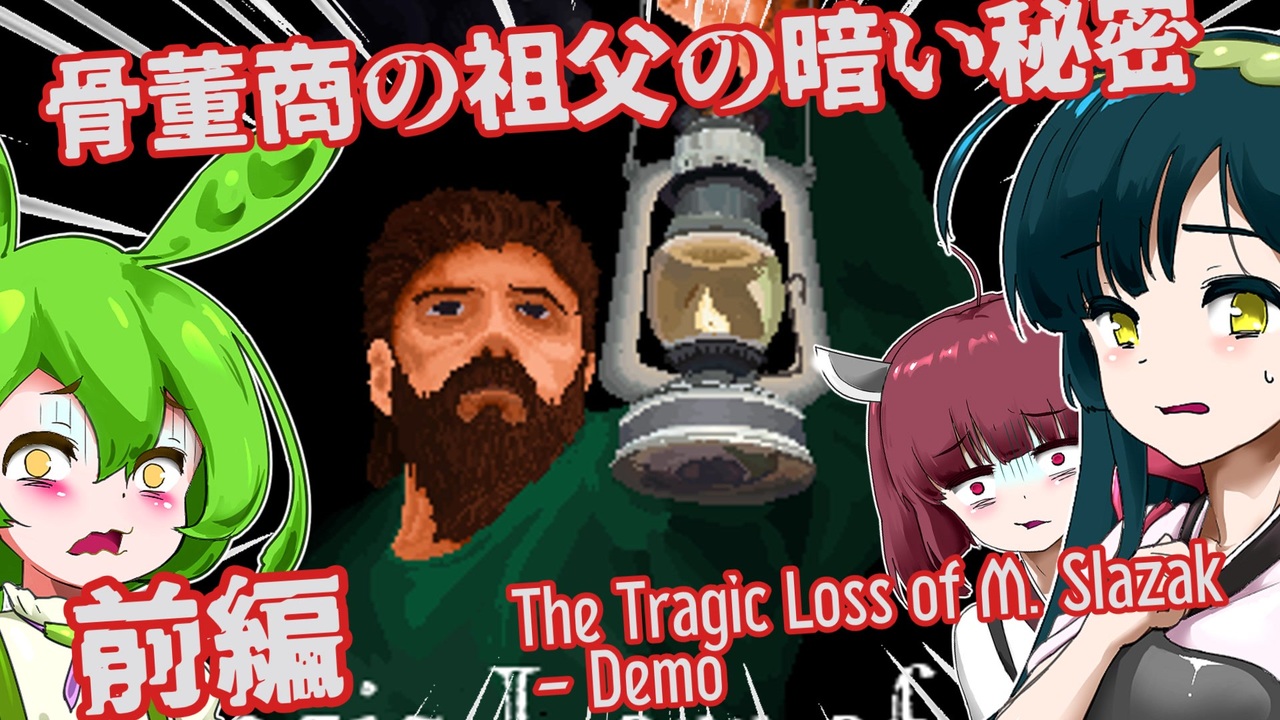 後編→<a href="https://www.nicovideo.jp/watch/sm43647900" class="watch">sm43647900</a><br>(2024/4/12 18:00)<br><br>ずんだもん、東北きりたん、東北ずん子が海外のホラーアドベンチャーゲームに挑むようです。<br><br>◎あらすじ◎<br>第二次世界大戦前、イギリスへと渡ったポーランド系移民のミロスラフ・スラザク。<br>長年骨董品店を営む彼は、ある日自分の親族たちを食事に招く。<br>客人たちが集まっても、ミロスラフは現れない。<br>心配になった客人たちはミロスラフの骨董品店へと向かうが…<br><br><br>※投稿者のガバ翻訳付きです。<br><br>配信ページ 日本語非対応<br><a href="https://beyondbooleans.itch.io/the-tragic-loss-of-m-slazak-demo" target="_blank" rel="noopener nofollow">https://beyondbooleans.itch.io/the-tragic-loss-of-m-slazak-demo</a><br><br>VOICEVOX:ずんだもん<br>VOICEVOX:青山龍星<br><a href="https://voicevox.hiroshiba.jp/" target="_blank" rel="noopener nofollow">https://voicevox.hiroshiba.jp/</a><br><br>COEIROINK:虚音イフ(応急措置モデル)<br>COEIROINK:ネルカウニ<br>COEIROINK:豪徳貞江<br>COEIROINK:八蜂鞠ククリ<br>COEIROINK:おふとんP<br>COEIROINK:黒聡鵜月<br><a href="https://coeiroink.com/" target="_blank" rel="noopener nofollow">https://coeiroink.com/</a><br><br>BGMをお借りしました。<br><a href="https://otologic.jp/" target="_blank" rel="noopener nofollow">https://otologic.jp/</a>