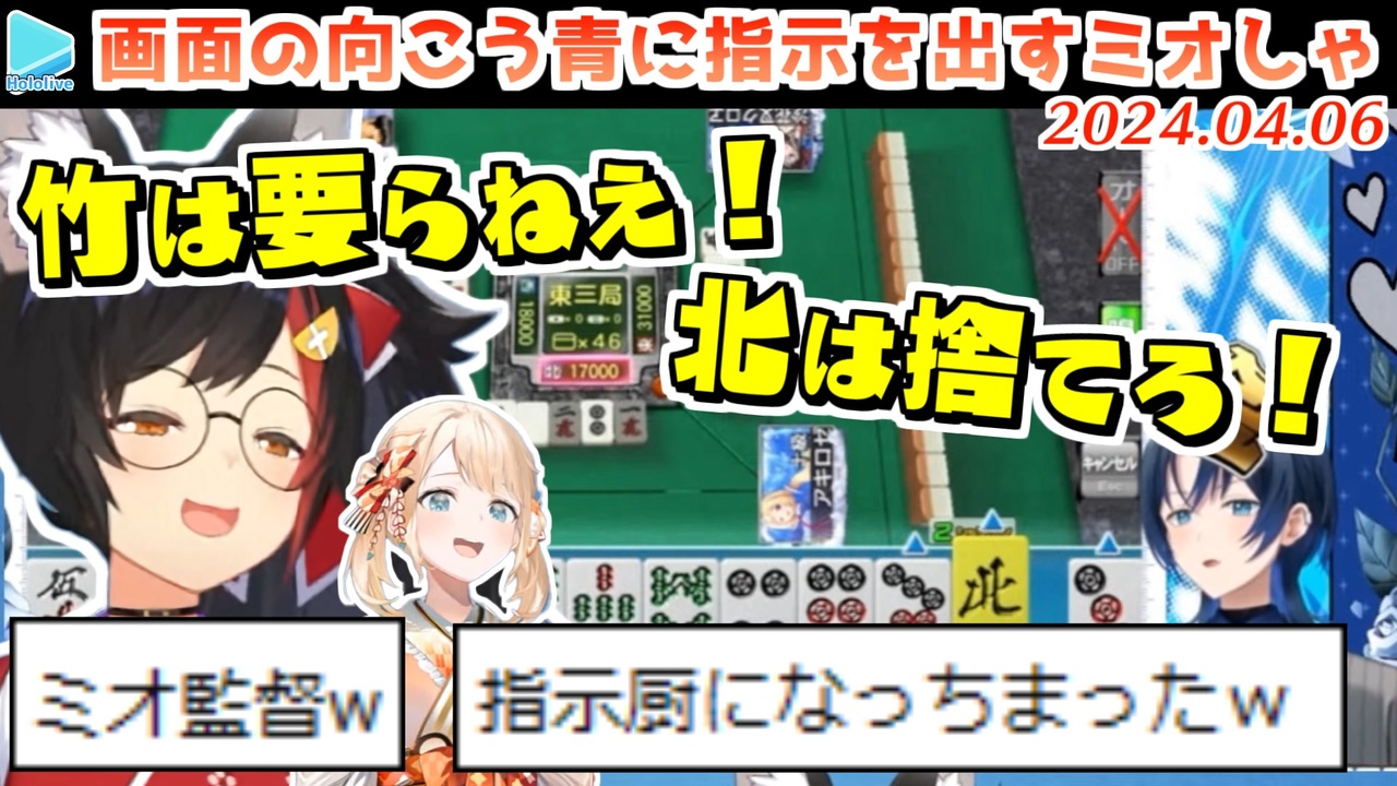 <a href="#" class="seekTime" data-seekTime="00:00" onclick="seekNicoPlayer('#00:00'); return false;">#00:00</a> おでこに金<br><a href="#" class="seekTime" data-seekTime="00:48" onclick="seekNicoPlayer('#00:48'); return false;">#00:48</a> 致命的ミス<br><a href="#" class="seekTime" data-seekTime="01:06" onclick="seekNicoPlayer('#01:06'); return false;">#01:06</a> ござるの満貫<br><a href="#" class="seekTime" data-seekTime="02:43" onclick="seekNicoPlayer('#02:43'); return false;">#02:43</a> 竹が要らん<br><a href="#" class="seekTime" data-seekTime="05:09" onclick="seekNicoPlayer('#05:09'); return false;">#05:09</a> 北を捨てろ<br><a href="#" class="seekTime" data-seekTime="08:25" onclick="seekNicoPlayer('#08:25'); return false;">#08:25</a> 番長に追い打ち<br><a href="#" class="seekTime" data-seekTime="10:08" onclick="seekNicoPlayer('#10:08'); return false;">#10:08</a> チーするな<br><a href="#" class="seekTime" data-seekTime="12:03" onclick="seekNicoPlayer('#12:03'); return false;">#12:03</a> なにもかも速い<br><a href="#" class="seekTime" data-seekTime="13:32" onclick="seekNicoPlayer('#13:32'); return false;">#13:32</a> 白上のPON<br><br>元動画様はこちら<br>◆運営視点<br>こより <a href="https://youtu.be/XiIV4frwyGI" target="_blank" rel="noopener nofollow">https://youtu.be/XiIV4frwyGI</a><br><br>◆チームA<br>ロボ子 <a href="https://youtu.be/YiqfEzCGAPk" target="_blank" rel="noopener nofollow">https://youtu.be/YiqfEzCGAPk</a><br><br>クロヱ <a href="https://youtu.be/BJNf7Ui3b4Q" target="_blank" rel="noopener nofollow">https://youtu.be/BJNf7Ui3b4Q</a><br><br>莉々華 <a href="https://youtu.be/8Ji1G0cLQ9Y" target="_blank" rel="noopener nofollow">https://youtu.be/8Ji1G0cLQ9Y</a><br><br>◆チームB<br>はあと <a href="https://youtu.be/n1p3Kr2gOAE" target="_blank" rel="noopener nofollow">https://youtu.be/n1p3Kr2gOAE</a><br><br>フブキ <a href="https://youtu.be/A0-Ej1eqYVk" target="_blank" rel="noopener nofollow">https://youtu.be/A0-Ej1eqYVk</a><br><br>はあと <a href="https://youtu.be/_cnEpE74CIA" target="_blank" rel="noopener nofollow">https://youtu.be/_cnEpE74CIA</a><br><br>◆チームC<br>青 <a href="https://youtu.be/bF04mbtc_sw" target="_blank" rel="noopener nofollow">https://youtu.be/bF04mbtc_sw</a><br><br>いろは <a href="https://youtu.be/fOPjJtfApA8" target="_blank" rel="noopener nofollow">https://youtu.be/fOPjJtfApA8</a><br><br>ミオ <a href="https://youtu.be/RUOvIhaFUNk" target="_blank" rel="noopener nofollow">https://youtu.be/RUOvIhaFUNk</a><br><br>◆チームD<br>ポルカ <a href="https://youtu.be/ffRQhaV-QKk" target="_blank" rel="noopener nofollow">https://youtu.be/ffRQhaV-QKk</a><br><br>はじめ <a href="https://youtu.be/TzaUtOQfBEY" target="_blank" rel="noopener nofollow">https://youtu.be/TzaUtOQfBEY</a><br><br>らでん <a href="https://youtu.be/tgOnpU4hm3E" target="_blank" rel="noopener nofollow">https://youtu.be/tgOnpU4hm3E</a><br /><span style="color: #b7b7b7; font-size: 10px;">ホロライブ切り抜き/なめたけ <a href="https://t.co/CBwJLnYR2c" target="_blank" rel="noopener nofollow">https://t.co/CBwJLnYR2c</a></span>